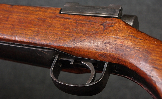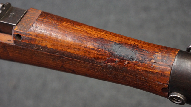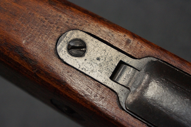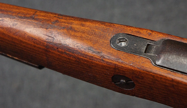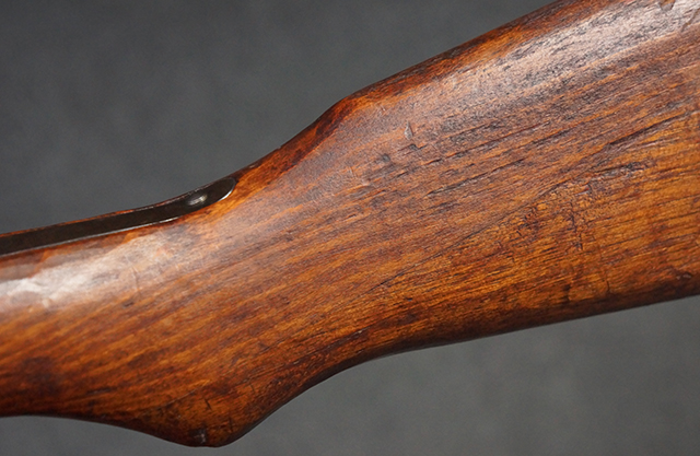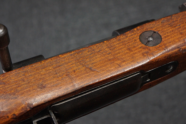 本品の銃身や機関部といった金属部は、若干の小傷や擦れ、経年による褪色等は見受けられますが、大きな欠損等は見られず、製造された時代を考慮すると十分に良好な状態が保たれています。 照星のガードに僅かに変形が見られるものの、あまり気にならないレベルのものです。 木部についても、保管に伴う打ち傷等は散見されますが、大きな破損等は見受けられず、全体にオリジナルの仕上げが保たれています。 傷み易い床尾板については、角の部分に若干の欠けが見受けられますが、欠け部分の色味等は比較的落ち着いており、それほど気にならないレベルのものです。 旧軍特有の銃床上下の継ぎ目についても、僅かに隙間が見られるものの、現状ガタつき等は見られません。 弾倉底板の開閉については問題なく行う事が可能です。 弾倉内の弾受 (フォロワー) 及び弾倉バネは入っています。