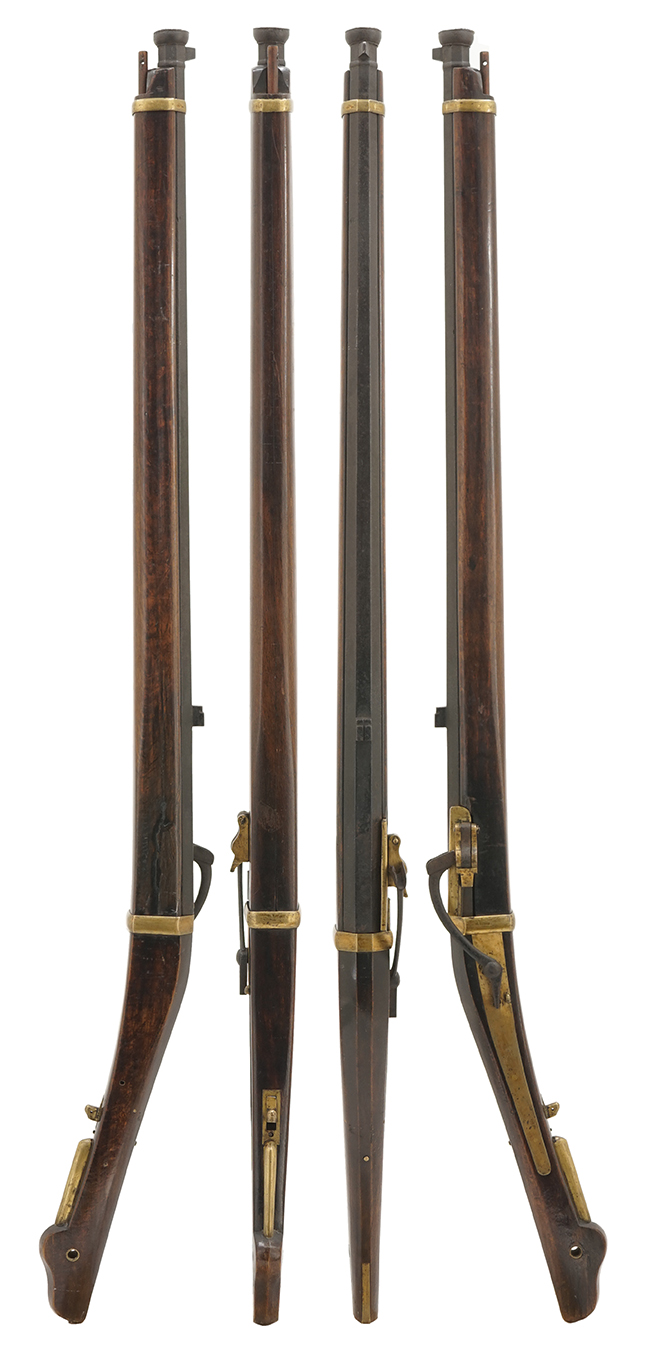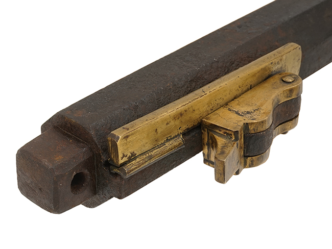 本品の筒 (銃身) は八角銃身で、銃口部分にはやや寸の詰まった丸柑子が設けられています。 先目当は杉形、元目当は筋割となっています。 銃身の下部には3箇所の目釘金具が設けられており、銃床の内部にもそれに合わせて3箇所の窪みが設けられていますが、目釘穴は元々開けられておらず、銃身は台 (銃床) に対して真鍮製の台締金により固定される構造となっています。