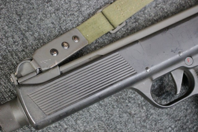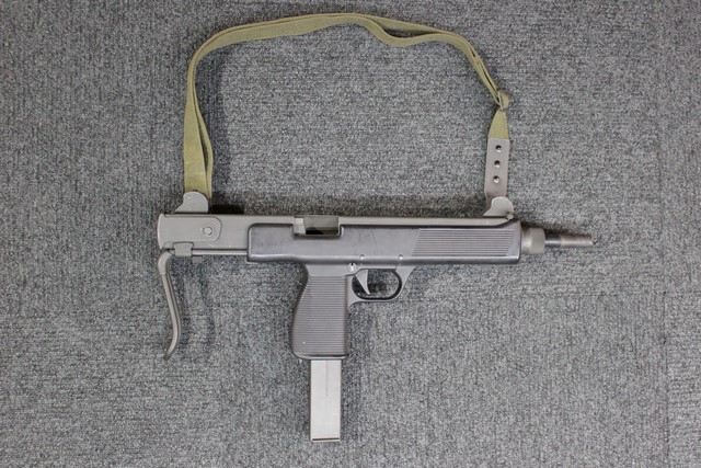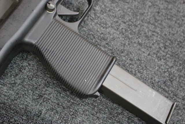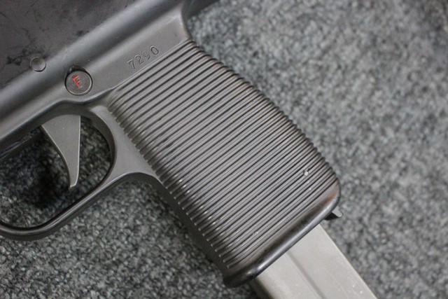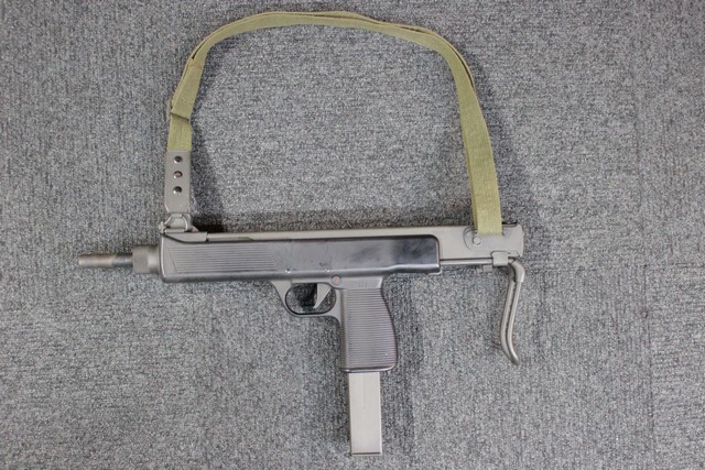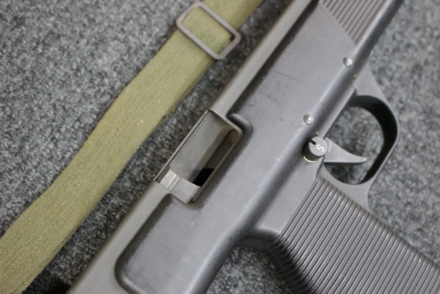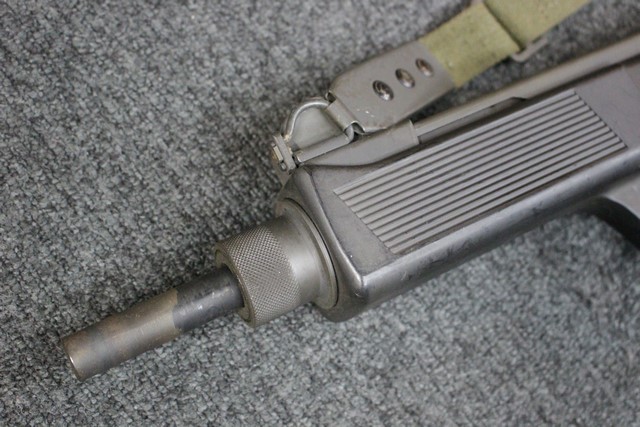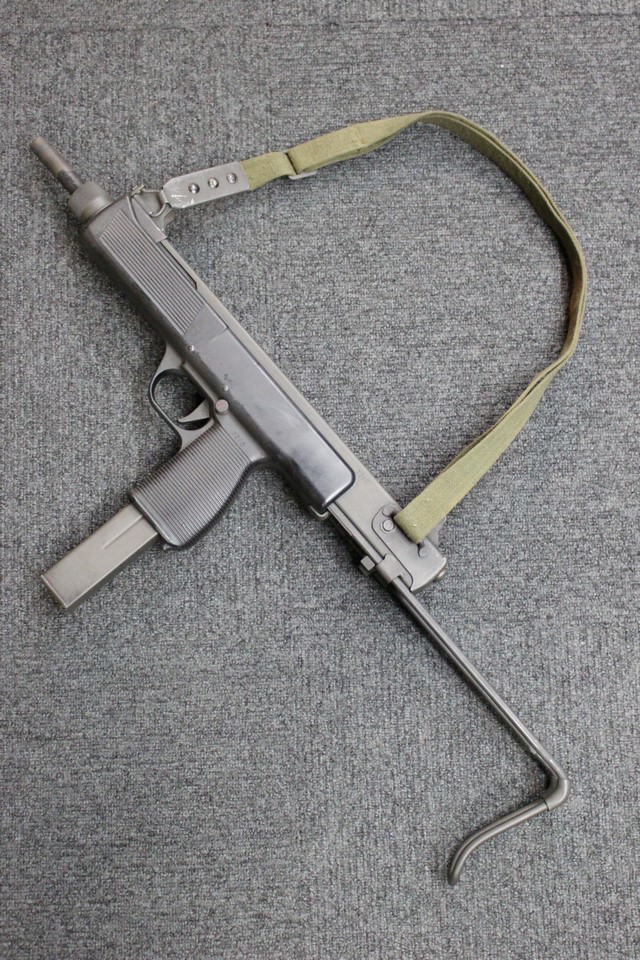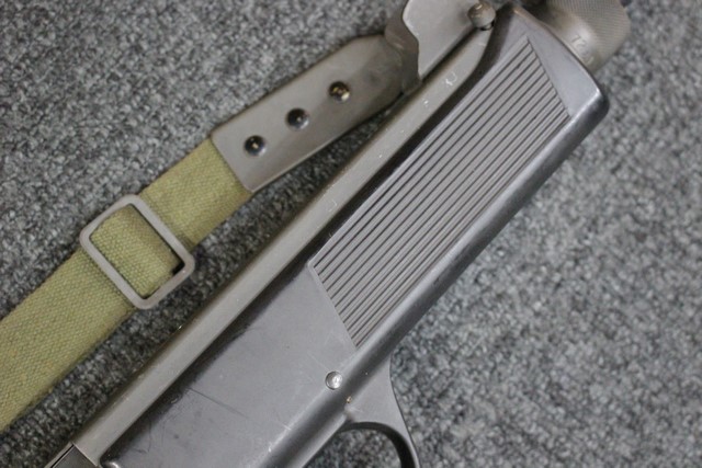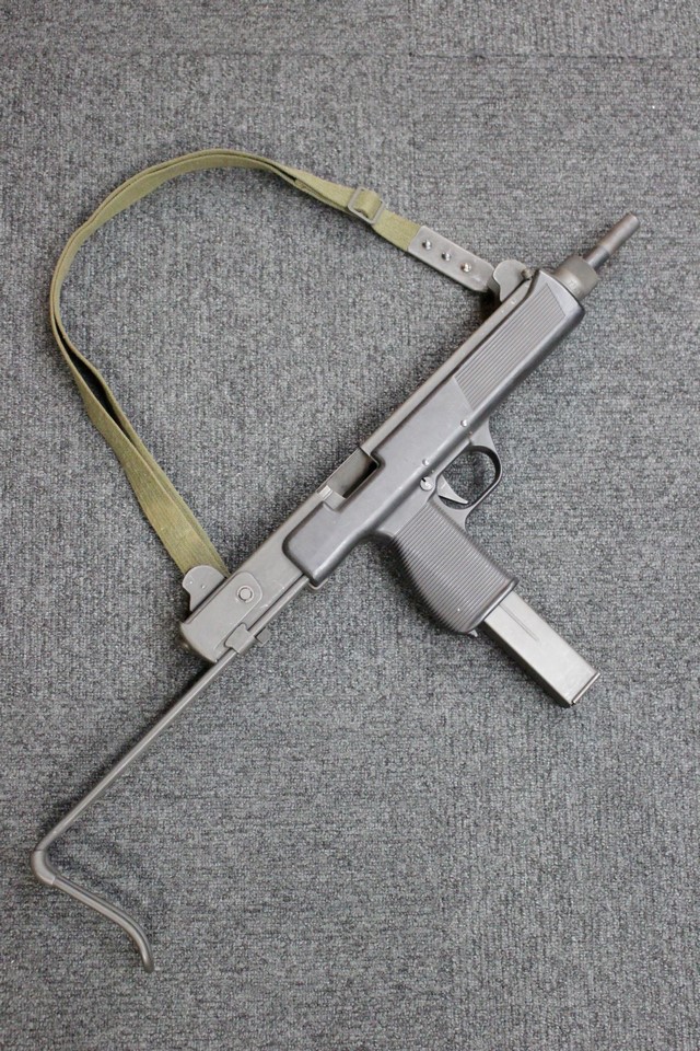 MPi 69短機関銃はステアー (Steyr-Daimler-Puch) 社で開発、生産された短機関銃で、1969年にオーストリアの国境警備隊と警察に制式採用になりました。 テレスコーピング・ボルト方式により全長を短縮している点や、マガジンをグリップ内に収納する点等にUZI短機関銃等からの影響が見られますが、フォアエンドからグリップにかけてのロア・フレームが一体成型の樹脂製となっているのが特徴です。 また、ストックがシンプルな伸縮式のワイヤー・ストックとなっている点もUZIとは異なっています。 さらにコッキング・ハンドルが前方のスリング・スイベルと兼用となっているのが本銃の最大の特徴で、これによりスリングを肩にかけたまま銃を前後させてのコッキングが可能となっています。 作動方式はシンプルなブローバック方式で、オープン・ボルト位置から射撃を行う構造となっています。 トリガー上部にはボタン式のマニュアル・セーフティを兼ねたセレクターが装備されており、ボタンを完全に左側に押し込んだポジションでは、トリガーの引きしろに応じてセミ/フル・オートマチック射撃の切り替えが可能です。 ボタンが左右の中間位置にある場合は、トリガーを途中まで引いてのセミ・オートマチック射撃のみが可能となります。