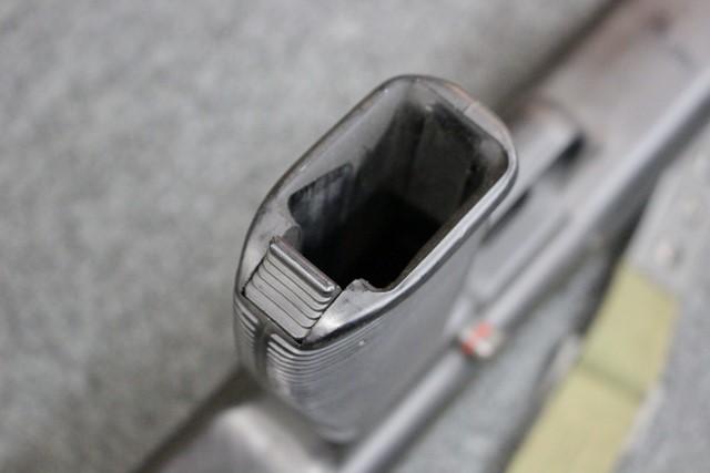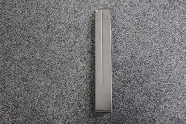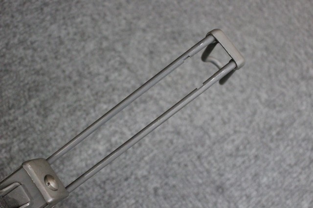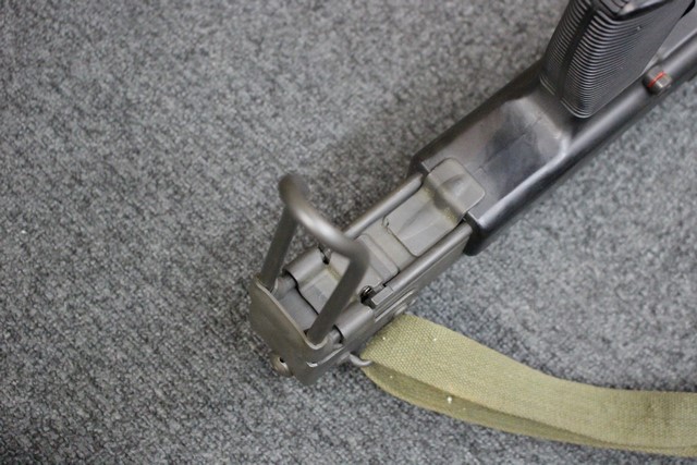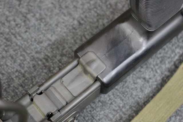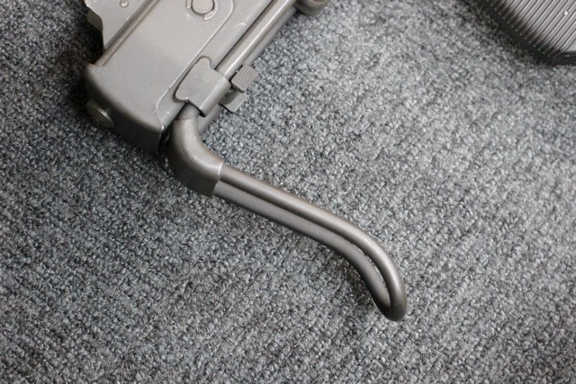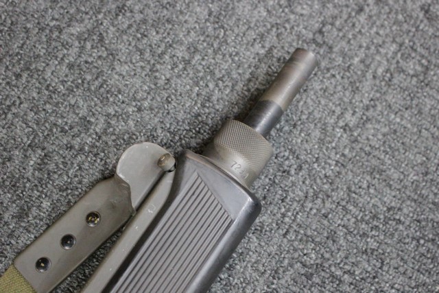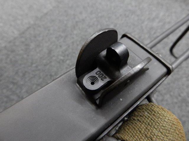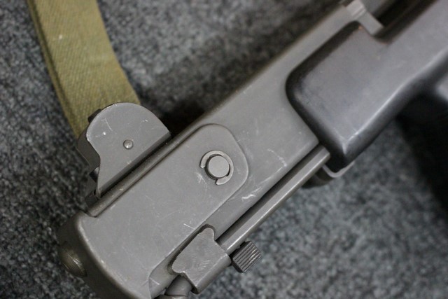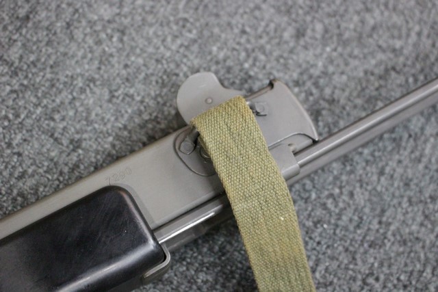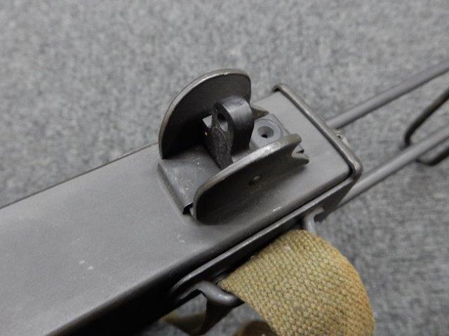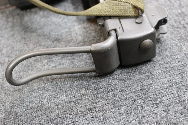 樹脂製ロア・フレームについても、やはりわずかな小傷や擦れは見受けられますが、割れやひびは見受けられず、グリップの滑り止めの溝も磨耗は感じられません。 リア・サイトの起倒やワイヤー・ストックの伸縮、マガジンの着脱、セレクター・ボタンの操作についても問題なくスムーズに行う事が可能です。 トリガーテンションはありませんが、セレクターのポジションによって引きしろが変化します。 ワイヤー・ストックについても引き延ばした際のガタつき等はほぼ見られません。 付属のマガジンについても、脱着時に着いた極僅かな小傷や擦れを除いて目立った凹みや変形等は見られず、全体にオリジナルのパーカー仕上げが残っています。 マガジン・スプリングは入っておりません。 キャンバス製のスリングは若干の汚れが見受けられますが、ODの色は鮮やかに残っており、解れらしい解れも見られず非常にしっかりとしていて良好な状態が保たれています。