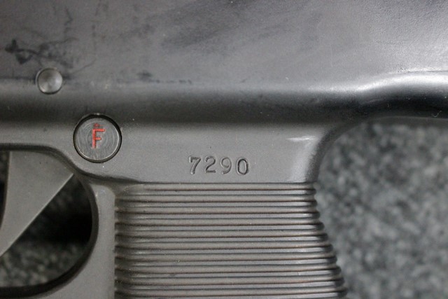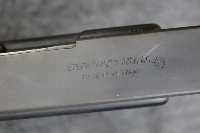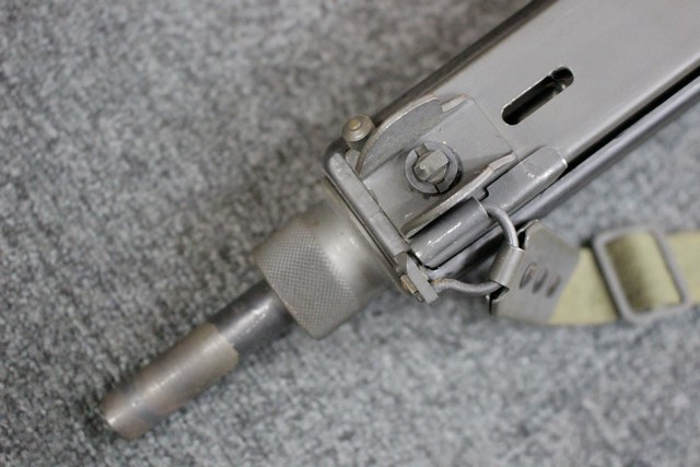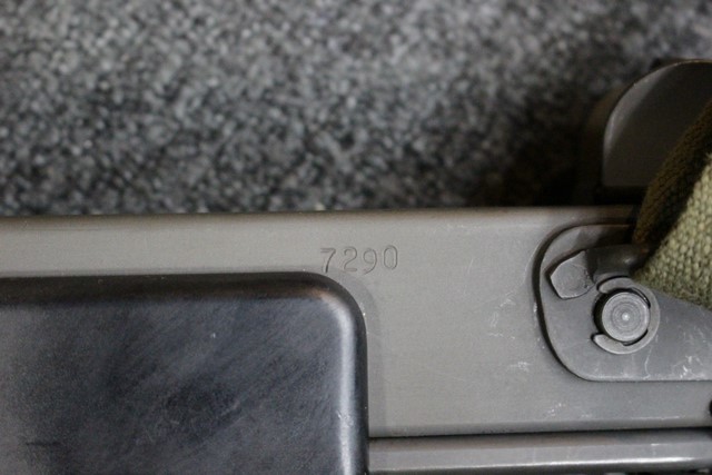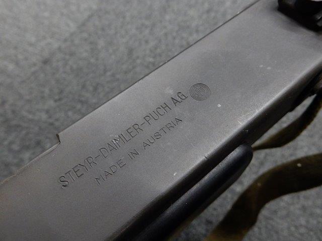 本品の機関部上部には「STEYR-DAIMLER-PUCH A.G. MADE IN AUSTRIA」のメーカー刻印及びステアー社のロゴが入っています。 本品のシリアルNo.は7290で、アッパー・レシーバーとロア・フレームでマッチしています。 尚、バレル・ナットのシリアルNo.も同じく7290となっています。 本品のスリングは前期タイプで前部に補強金具が見られます。