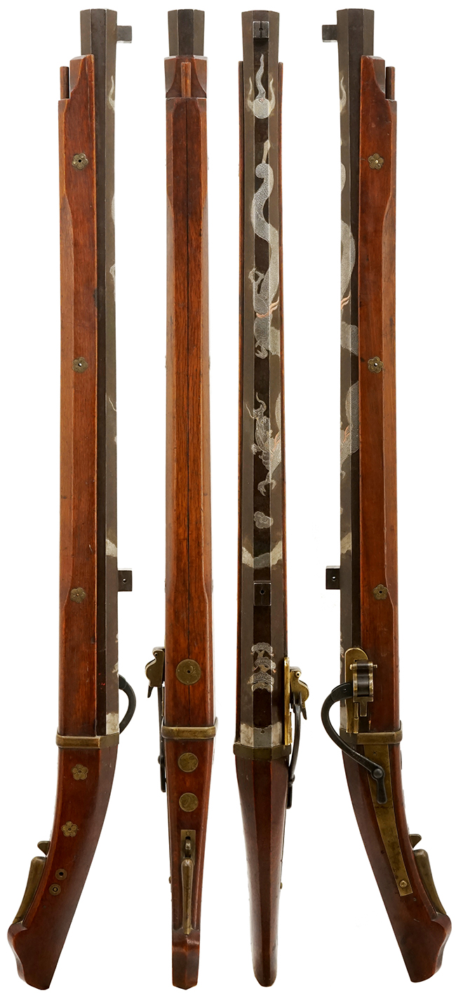 龍は水に潜み、空を飛んで雲を起こし雨を呼ぶ霊力があるとされる想像上の動物です。 古代中国では龍は皇帝の象徴とされ、日本でも縁起の良さや長寿を表すものとして昇龍・降龍図が描かれました。 不動明王が龍の姿になって襲いかかってきた異教徒の剣を飲み込もうとした逸話から龍や龍が巻きつく倶利伽羅剣(くりからけん)は破邪の象徴として武士に好まれ、武具に多く使用されました。 加えて、仏教においては龍は如意宝珠(にょいほうじゅ)を手にしていることによりどんな願いでも叶えることができる神通力を持っていて、それ故に煩悩があり解脱することができませんが宝珠の玉を離せば悟りを開くことができるとされました。 本品は「降龍図」の名の通り、天から地上へ降りていく龍が描かれております。 龍は宝珠の玉を手にしておらず、龍の後方、銃口側に描かれた宝珠の玉を振り返って見ているようです。日本における龍は、中国伝来の仏教における龍が日本古来からあった蛇神信仰を基に、民間の龍神・龍王・龍宮の信仰と混交したために様々なイメージを内包しており「降龍図」に関しても解釈は多岐に渡ります。 本品の降龍図は一風変わっており、解釈の余地がございます。 視点を変えと銃口側に宝珠の玉を配しているところから、鉄砲の玉と宝珠の玉を掛けた洒落も感じられる味わい深い意匠です。(MM)(KK)