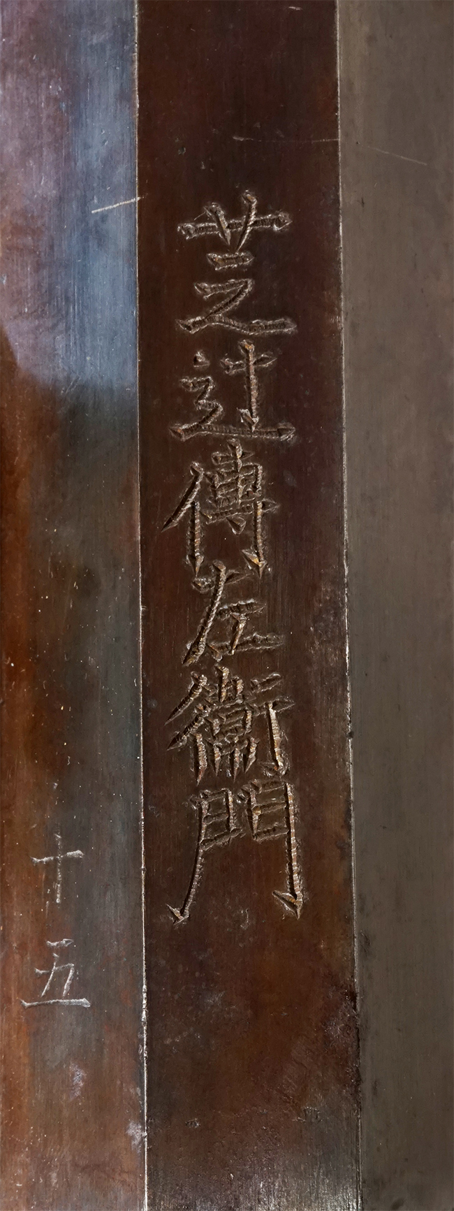 本品は在銘で、筒 (銃身) の下面には「芝辻傳左衛門」の銘及び「十五」の漢数字が切られています。 「芝辻傳左衛門」は「全国鉄砲鍛冶銘鑑」P.188に掲載されている鉄砲鍛冶の一門で、居住地は名古屋、尾州、播州、阿州、摂州といった記載が見られますが、本品が芝辻傳左衛門のどの人物により製作されたかについては現時点では特定はできませんが堺の注文筒と思われます。 幕末頃の作でしょう。