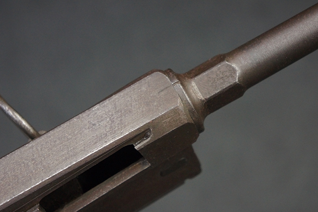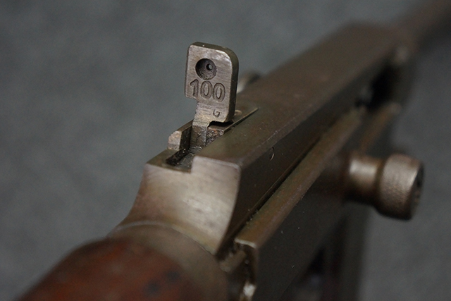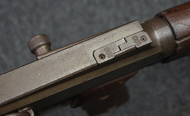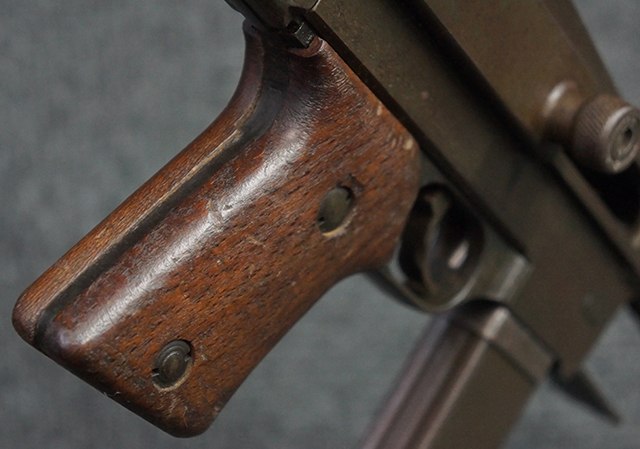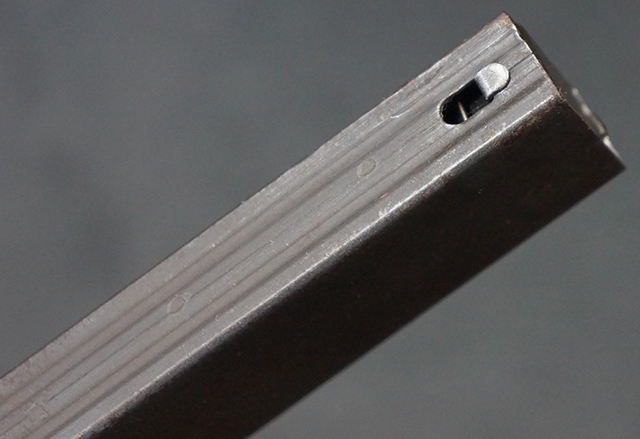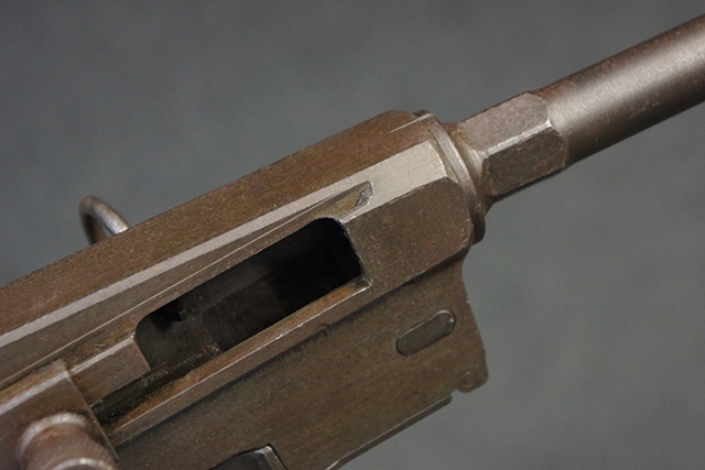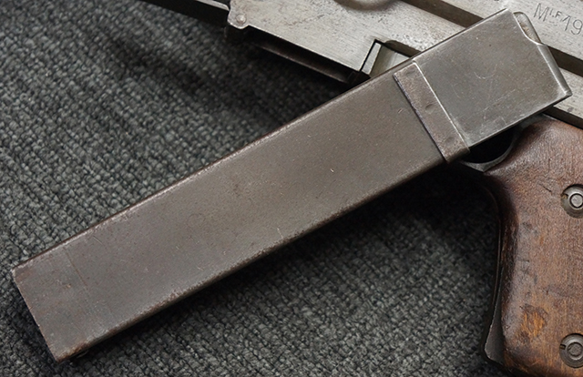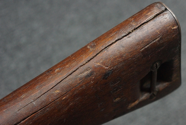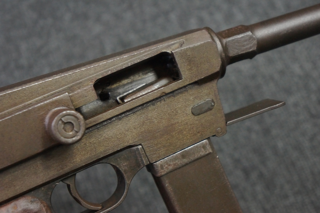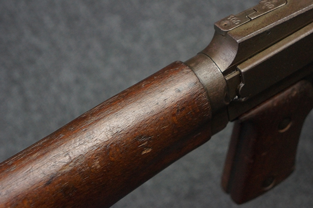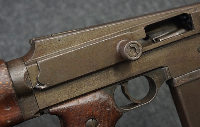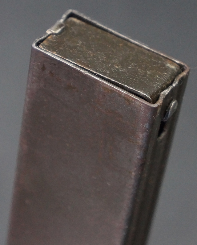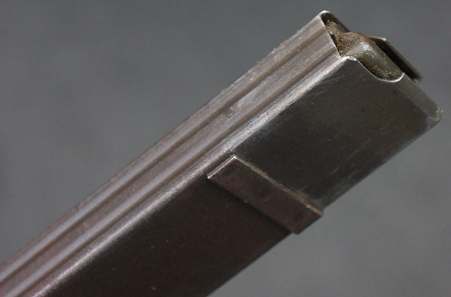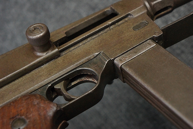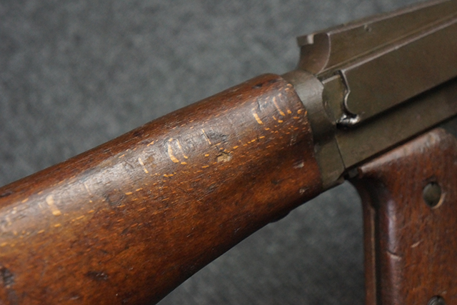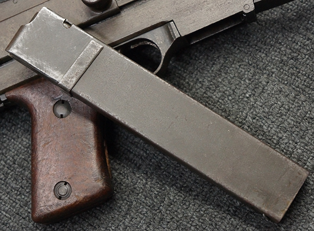 本品は全体にやや使用感が見受けられ、金属部はやや打ち傷や表面錆痕が見受けられますが、大きな破損や欠損は見受けられず、比較的しっかりとした状態が保たれています。 グリップ・パネルやバット・ストックといった木部については、左側グリップ・パネルの前部にやや目立つ欠けが見られる他、バット・ストック上部に大きくひびが入っています。 バット・ストックのレシーバーへの取り付けはややがたつきが見受けられます。 リア・サイトの起倒やマガジンのダスト・カバーの開閉は問題なく行う事が可能です。 マガジン装着時に若干のがたつきが見られますが、ロックはしっかりと掛かり、脱落してしまう心配はありません。 マガジンの着脱についても問題なく行う事が可能です。 付属のまがじんについてもやや擦れや若干の表面錆は見受けられますが、大きな変形等は見受けられず、概ねしっかりとした状態が保たれています。 尚、マガジン・スプリングは入っています。