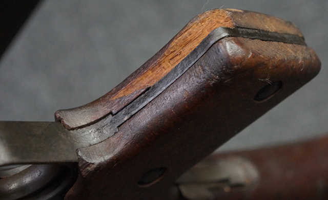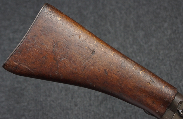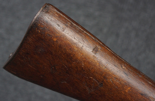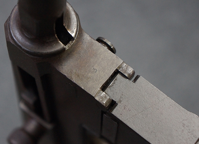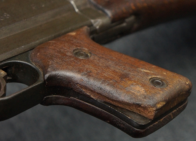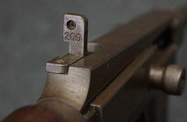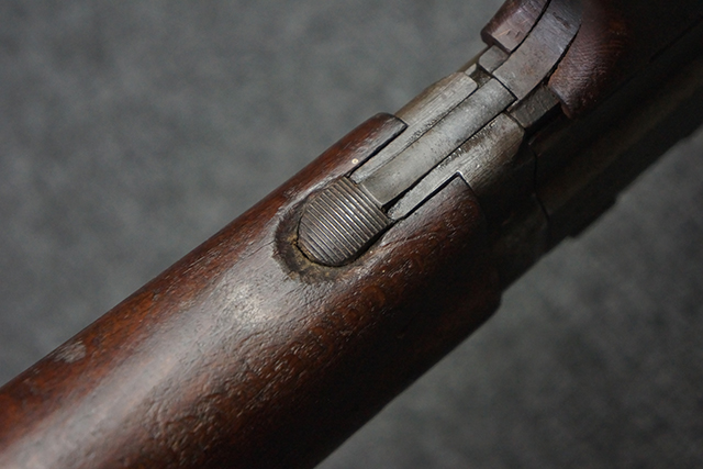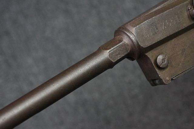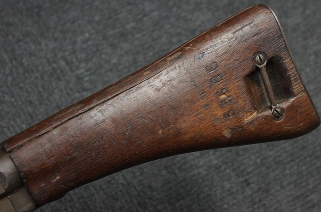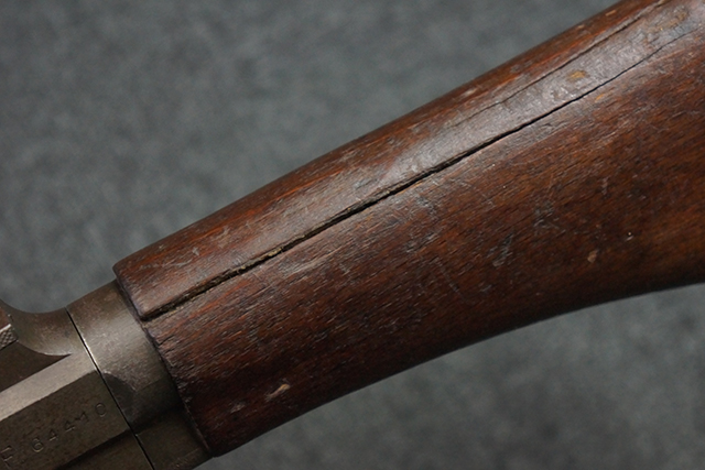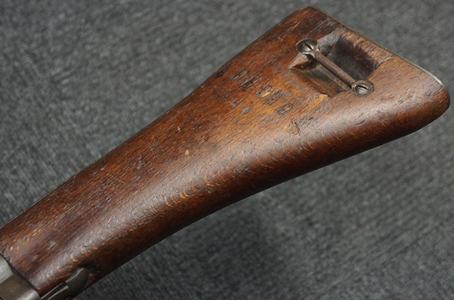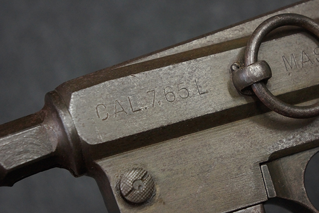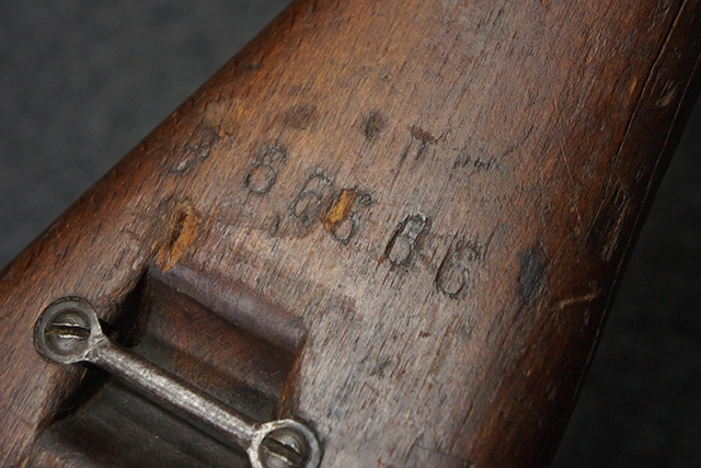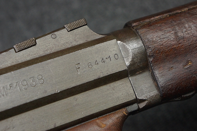 本品のレシーバー左側面にはシリアルNo.F64410の他、一部薄くなっていますが「CAL 7,65L MAS MLE 1938」のモデル名刻印が入っています。 また、トリガー・ガード前部にはグリップ・フレームのシリアルNo.67653が入っており、木製ストック左面には「66666」と読めるシリアルNo.が打刻されています。