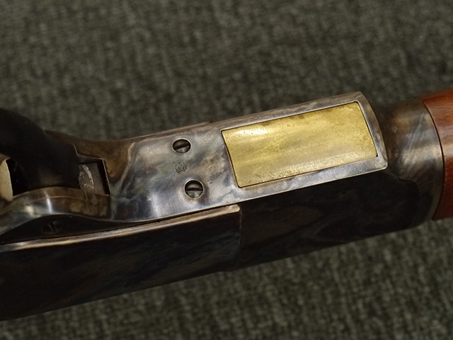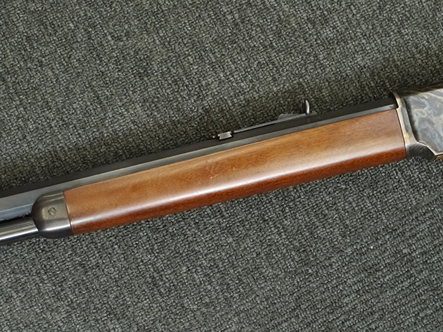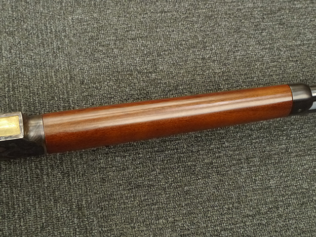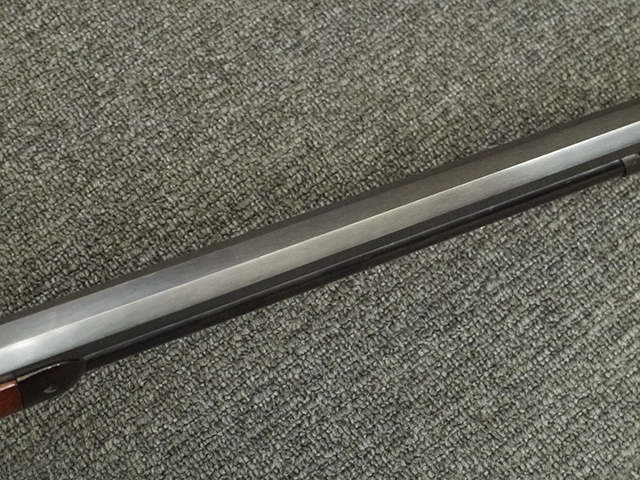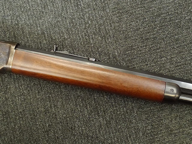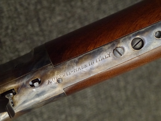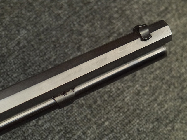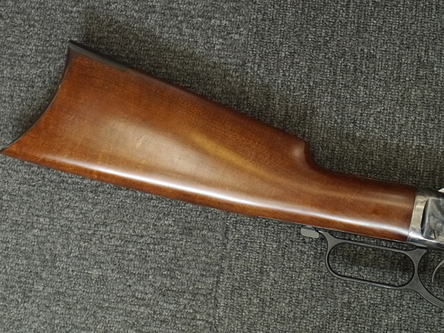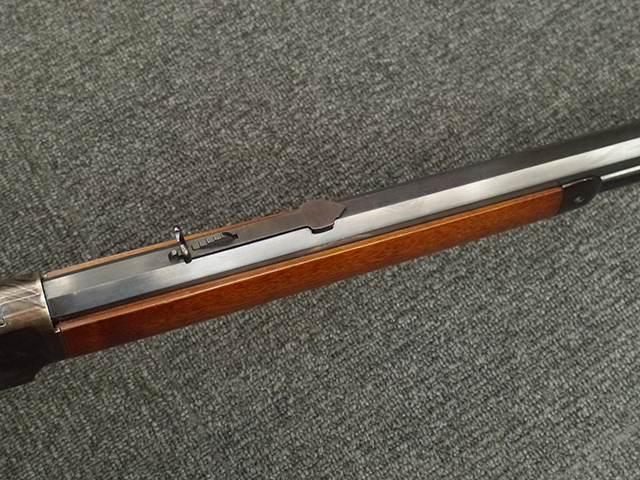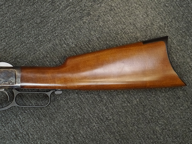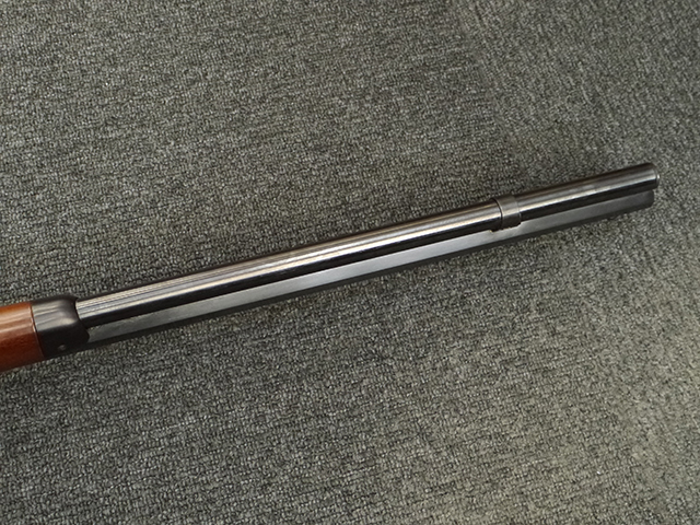 本品はイタリアのA.Uberti (A.ウベルティ) 社製復刻品のウィンチェスター M1873 ライフルを無可動加工した品です。 銃身はオクタゴン・バレルで、銃身長は24インチとなっています。 アッパー・タング上面に「MODEL 1873」のモデル名刻印が入っています。 また、レシーバー下面にUberti社のロゴが入っている他、ロア・タング下面には「A. UBERTI-MADE IN ITALY」のメーカー刻印が入っています。