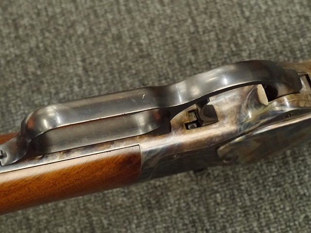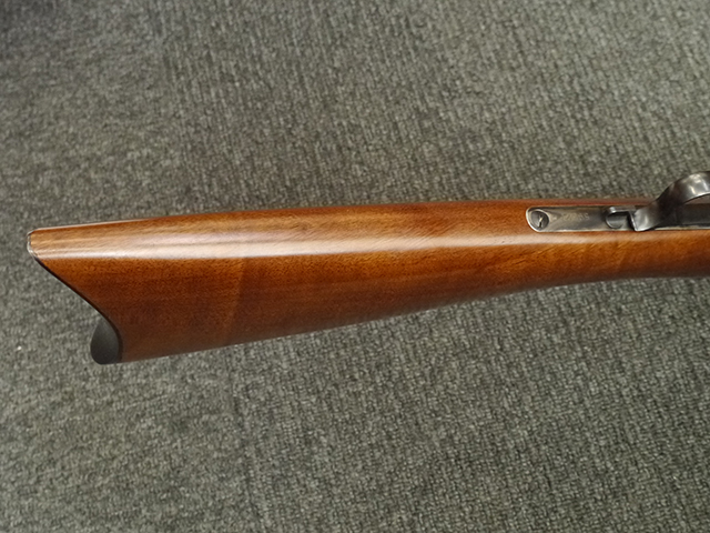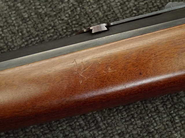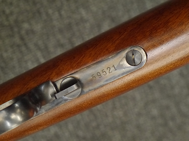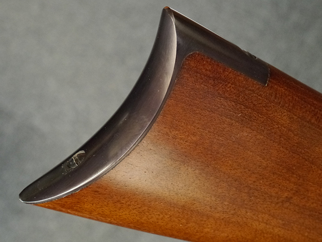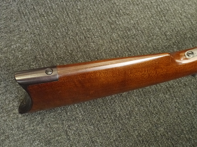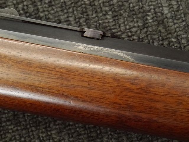 本品は全体に使用感は殆ど見受けられず、銃身や機関部といった金属部は僅かな小傷や擦れを除いて目立った欠損等は見受けられず、銃身のブルー仕上げや機関部のケースハードン仕上げは美しく保たれています。 ハンドガードやバット・ストックについても、若干の保管上の打ち傷等を除いて大きな破損等は見られず、オリジナルの仕上げも良好に残っています。 傷み易いバット・プレートは、角の部分に僅かに打ち傷が見られますが、全体としては大きな変形や錆なども見られず、良好なコンディションが保たれています。 ハンドガードは僅かに前後に遊びが見られますが、殆ど気にならないレベルのものです。 ダスト・カバーの開閉やリア・サイトの調整は問題なく行う事が可能です。 トリガー・ガードを兼ねた装弾用のアンダー・レバーはボルトやハンマーとは連動していませんが、レバーのテンションは効いており、レバー操作に合わせて装弾エレベーターが上下します。 またレバーを握り込んでいない状態では、トリガー後方にバーが飛び出しトリガーがロックされます。 ハンマーはテンションはありませんが前後に可動します。 弾倉内のスプリング及びフォロワーは入っていません。