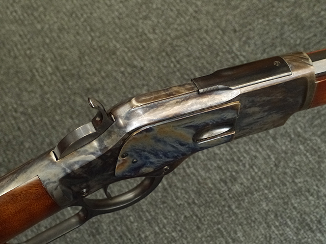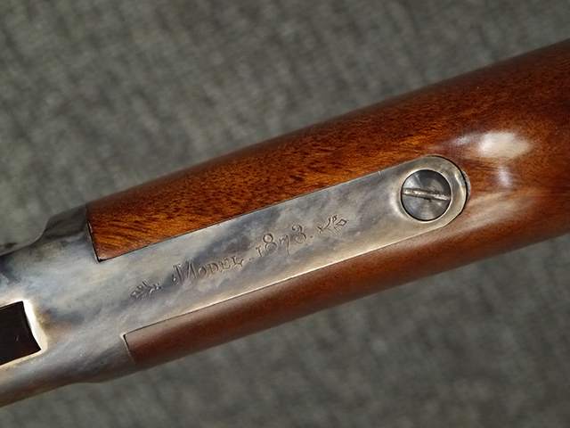 .44ヘンリー・リムファイア弾を使用するM1866では、フレームが銅と錫の合金である砲金により製作されていましたが、より強力なセンターファイア式の弾薬を使用する為には強度的に不足していた事から、M1873では鉄製へと変更されました。 他にも排莢孔へのダスト・カバーの追加や機関部サイド・プレートの形状変更など若干の改良がなされています。 尚、フレーム両側面のサイド・プレートはネジ留めによる固定となり取り外しが可能となりました。 使用弾薬は当初.44-40 WCFchester弾仕様のみでしたが、その後.38-40 Winchester弾及び.32-20 Winchester弾仕様のモデルが追加され、.44 WCF、.38 WCF、.32 WCFといった、使用弾薬を示す刻印が打刻されるようになりました。 尚、弾倉がチューブ式である為、後方の弾の弾頭が前方の弾の雷管部を刺突して暴発しないよう、弾頭の先端はフラットな形状となっています。 また、弾薬の全長は口径に関わらず1,592インチ (約40mm) と統一されていました。
