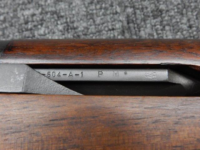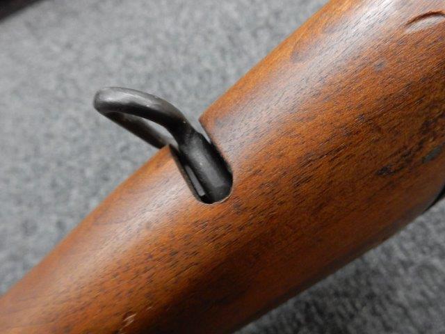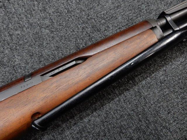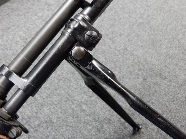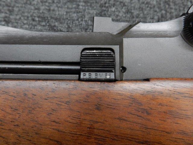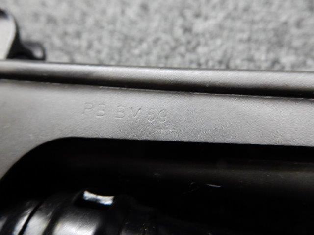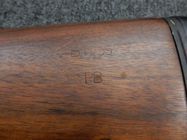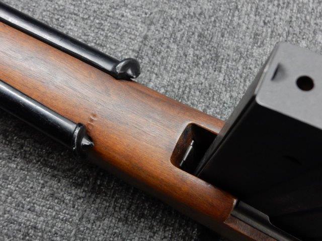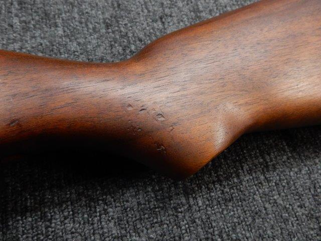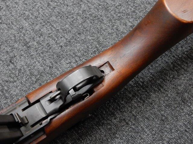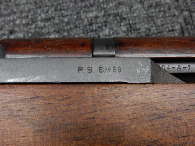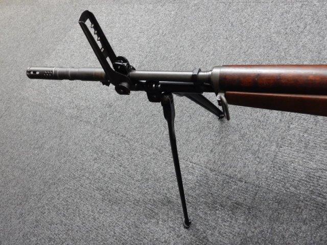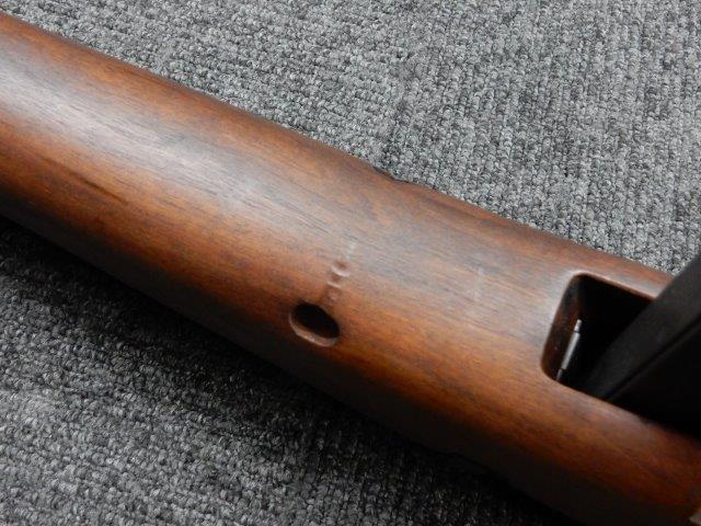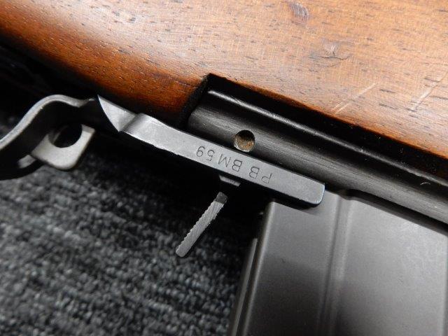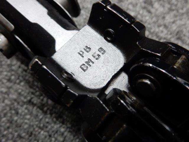 金属部はわずかな退色のほか、全体的に小さな打ち傷、擦り傷があり、二脚の黒焼付け塗装の一部剥げが見られますが、目立つものはありません。 木製ストックとハンド・ガードは、アッパー・ハンドガードの色見が若干濃い印象ですが概ねマッチしています。バット・ストック左側面に“BM59 PB"の刻印が確認出来ます。