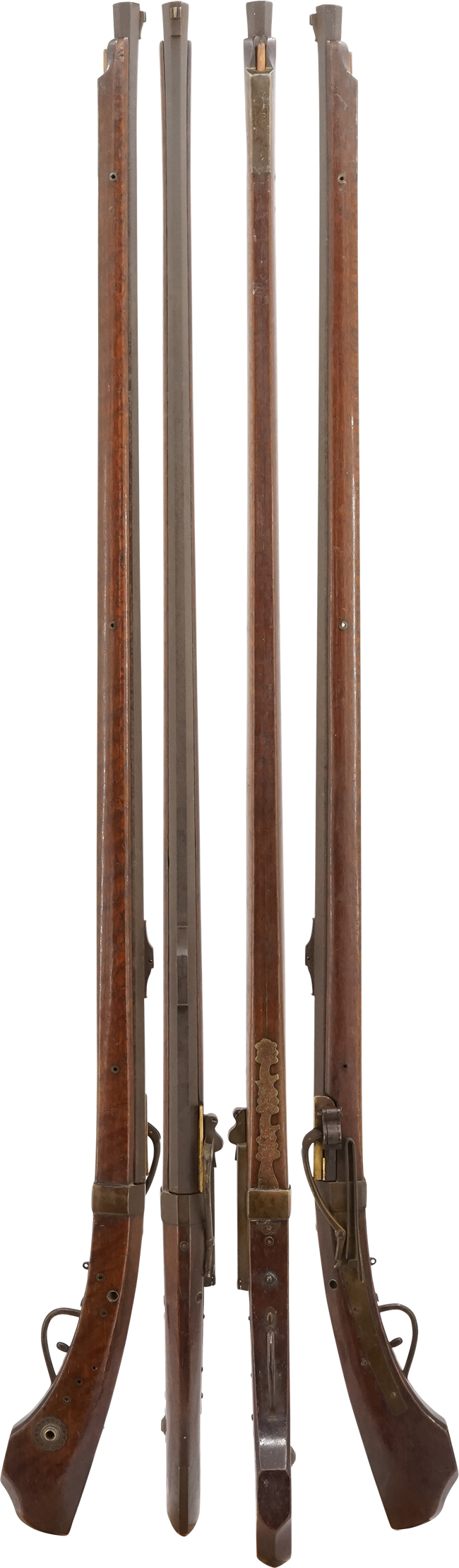 台木 (銃床) については、全体に打ち傷や線傷が散見され、銃床先端に一部ヘアライン・クラックが見受けられるものの、全体としては大きな欠損も見られず、艶のある仕上げも大部分に残っています。 カラクリの地板、胴金、火挟、弾金、雨覆、火蓋といった真鍮部品は適度な時代感が付いた良い雰囲気となっています。 用心金など各部の取り付けについては、現状がたつきもなくしっかりとしています。