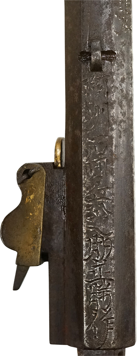 本品は在銘品で、銃身下面に「鍜張 阿州石田兵之助正勝作」の銘が切られています。 「石田兵之助正勝」は阿州鉄砲鍛冶の一人で、「全国鉄砲鍛冶銘鑑」P.24及び「全国鉄砲鍛冶銘地域別分類」P.305に掲載されています。