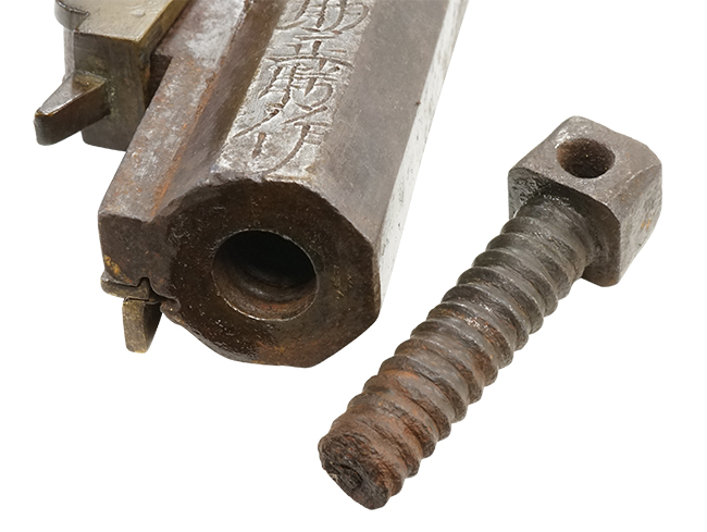 本品の筒 (銃身) は全体に時代錆が表れ、銃床に隠れる銃身下面にはやや表面錆痕や若干の痩せが見受けられますが、大きな欠損等は見受けられず、概ねしっかりとした状態が保たれています。 銃身下面の銘についても比較的はっきりと確認出来ます。 銃身下面の目釘金具と銃床の目釘穴の位置は3箇所とも一致しています。 尚、目釘は付属致しません。