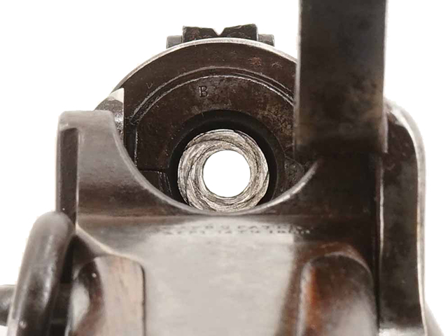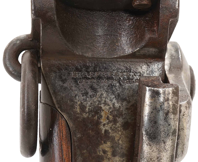 本品の機関部後部上方に「STARR’S PATENT, SEPT. 14TH 1858」のパテント刻印が二行にわたって打刻されており、本体右側面のサイド・プレートにも「STARR ARMS CO., YONKERS, N.Y.」のメーカー刻印が二行にわたって比較的ハッキリと入っています。 銃身上部にはやや判読しづらいものの、「STARR ARMS Co YONKERS, N.Y.」の刻印がしっかりと打刻されています。 シリアル No.の37508は銃身の薬室右側面に入っています。 また、ストック左側面のサドル・リングのすぐ後ろには非常に薄くなっていますが、Samuel T. Bugbeeのものと思われるCartoucheと呼ばれる検査官刻印 (STB Cartouche) が入っています。 Bugbee検査官は1864年の丸一年と1865年の南北戦争終結までニューヨーク州のYONKERSにあるスタール造兵廠(Starr Armory)のカービンを合衆国政府から派遣されて検査した記録が残っています。 これによって本品は南北戦争で使用または合衆国政府で準備されていたことが裏付けされています。
