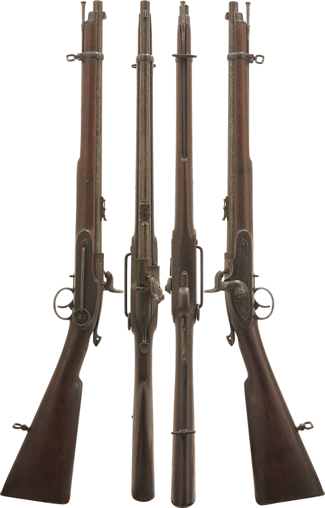 本品は全体に時代が付いた使い込まれたコンディションとなっており、機関部や銃身といった金属部は全体に時代錆や表面錆痕の他、朽ち込み痕が散見されますが、大きな欠損などは見受けられず、概ねしっかりと状態が保たれています。 銃床についても、全体にやや打ち傷や線傷の他、一部に虫喰いの補修痕が見受けられます。 また、ブリーチ・レバー周辺にやや欠けが見受けられる他、ロア・タング後方にヘアライン・クラック、バット・プレート取付部周辺に欠けの補修痕が見受けられますが、いずれも強度的には影響のないレベルのものです。 バット・プレートについても、やや表面錆痕や朽ち込み痕が見受けられる他、銃床との取付部に若干の隙間が見られますが、取り付け自体はがたつきもなくしっかりとしています。 ストック内コンパートメントの蓋は開いた際のスプリング・テンションが効き難くなっていますが、閉じた状態では簡単に開いてしまう事はありません。 前後のスリング・スイベルは現状固着等は見受けられず、動きもスムーズです。 撃発機構の作動については完全で、ハンマーはフル/ハーフ・コック共にしっかりと掛かり、フル・コック状態でトリガーを引くとハンマーが力強く落ちます。 ブリーチの開閉についても問題なく、開いた状態でのスプリング・テンションも効いています。 パーカッション・ニップルやハンマーの打撃面の縁にやや変形が見受けられますが、大きな欠け等は見受けられず、概ねしっかりとした状態が保たれています。 銃口から薬室まで銃身内は完全に通っており、パーカッション・ニップルの火穴も抜けています。 トリガー・ガード前方のニップル・チェーン取り付け金具に一箇所亀裂が見られます。 尚、ニップル・チェーンは付属致しません。 銃身内はやや表面錆による荒れが見られますが、特徴的なホイットワース式のライフリングもかろうじて確認出来ます。 リア・サイトは表面錆や若干のスライダーの変形が見られますが、既倒や調整は問題なく行う事が可能です。 さく杖が付属致します。