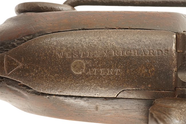 本品は一見するとエンフィールド 管打式砲兵銃のようにも見えますが、前述のように特殊な後装式になっているだけではなく、サイド・ロック・プレートの形状から全体的に細身の全く別のものであることが判ります。 「モンキー・テイル」と呼ばれる所以になったブリーチ・レバーの上面には「WESTLEY RICHARDS PATENT」の刻印及び同社の三角形の刻印が入っています。 リア・サイト後方の銃身上面には「WHITWORTH PATENT」の刻印が綺麗に入っています。 これはホイットワースが当初銃を製造する工場を保有しておらず、ウエストリー・リチャーズ社がホイットワース社の銃を製造しており、その後技術提携していた名残りです。 また、銃身基部の両側面には口径表示である「.483」及び「.451」の刻印が入っています。 薬室左側面にシリアル No.3067に加えて、複数のバーミンガム・プルーフ・ハウスの刻印が入っています。 さらにサイド・ロック・プレートにはやや判読し難くなっていますが、「WESTLEY RICHARDS & Co.」の刻印及び三角形の中に製造年である1869の年号が入った刻印が確認出来ます。 シリアルNo.は薬室左側面と銃床下面 (ロア・タング後方) でマッチしています。