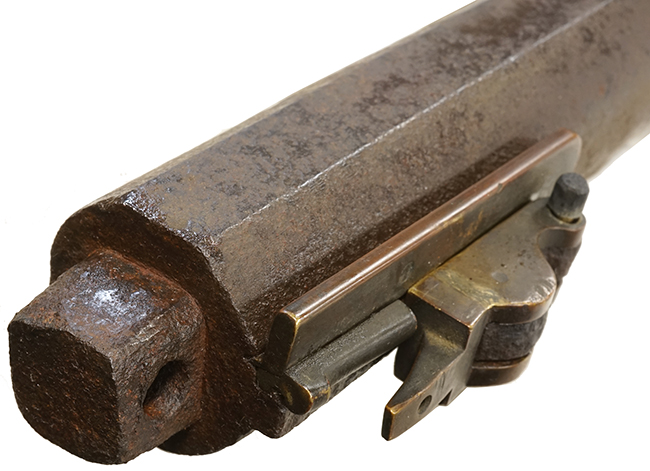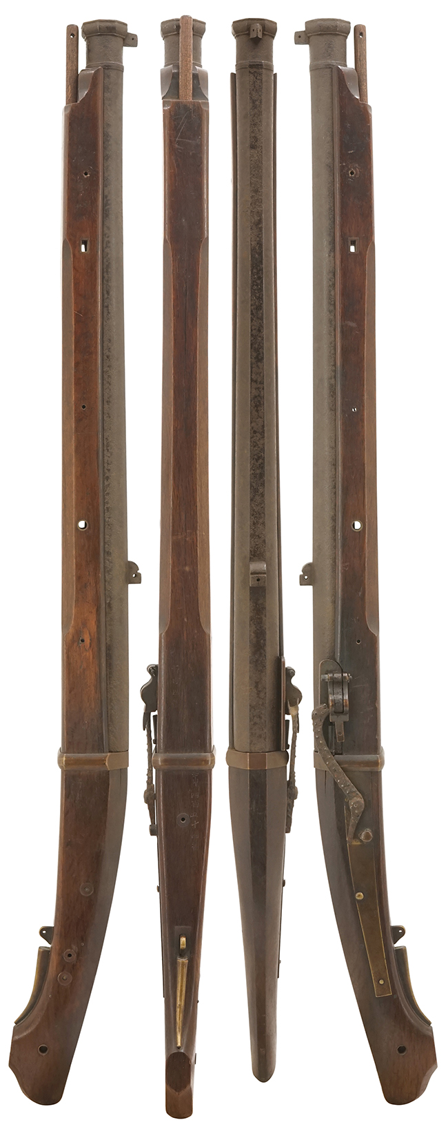 本品の筒 (銃身) は後方に向かって緩やかに広がった丸銃身で、上面のみ平坦となった「表一角」と呼ばれる形状となっています。 銃口には筋立ての施された八角柑子が設けられており、元目当は筋割、先目当は杉形となっています。 銃身と台木 (銃床) は3箇所の目釘により固定される構造となっています。 銃床は全体に装飾などは殆ど見受けられず、カラクリの鋲裏座金に円型の金具が用いられている他は目立った飾り金具等も見られず、目釘金具についても座金は取り付けられていません。 銃床前部側面には腕貫穴と呼ばれる小型の長方形の窓が開いており、窓の周りは真鍮で装飾補強されています。