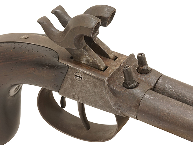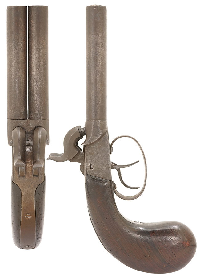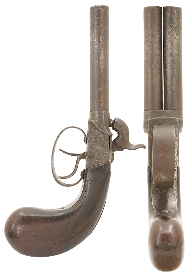 本品は銃身長約83mm、口径約10mmで、至近距離での護身用として当時販売されたものと考えられます。 銃身はターン・オフ・バレル(Turn-off Barrel)と呼ばれるねじ込み式で、取り外しが可能な構造となっています。 通常、管打ち式銃ではフレームと銃身が一体型の場合は銃口からパッチと呼ばれる布切れと一緒に弾を押し込んで装弾しますが、ターン・オフ・バレルの場合は、銃身を外してから薬室に直接装薬を装填し、弾頭を乗せてから銃身を取り付けて射撃を行いました。 使用される弾の直径は口径よりも僅かに大きなものとなっており、これにより銃口から装弾する銃器 (Muzzleloader) に比べて、より大きな銃口初速を得る事が出来ました。 本品の銃身内はライフリングの施されていない滑腔銃身となっています。 銃身内にはライフリングのような溝が切られていますが、これはねじ込み式の銃身を取り外す際にドライバーなどを差し込んで回す為のものです。 左右の銃身にはフロント・サイトは設けられていませんが、パーカッション・ニップル後方の銃身後端がせり上がってその中央部分にノッチ・タイプのリア・サイトが設けられています。 このVノッチと左右の銃身の間の谷間を合わせて照準を行ったものと思われます。 グリップは紫檀製と思われ、当時の欧州製パーカッション・ピストルで一般的なバグ・タイプ・グリップと呼ばれる丸みを帯びた形状のものが取り付けられています。 (MM)