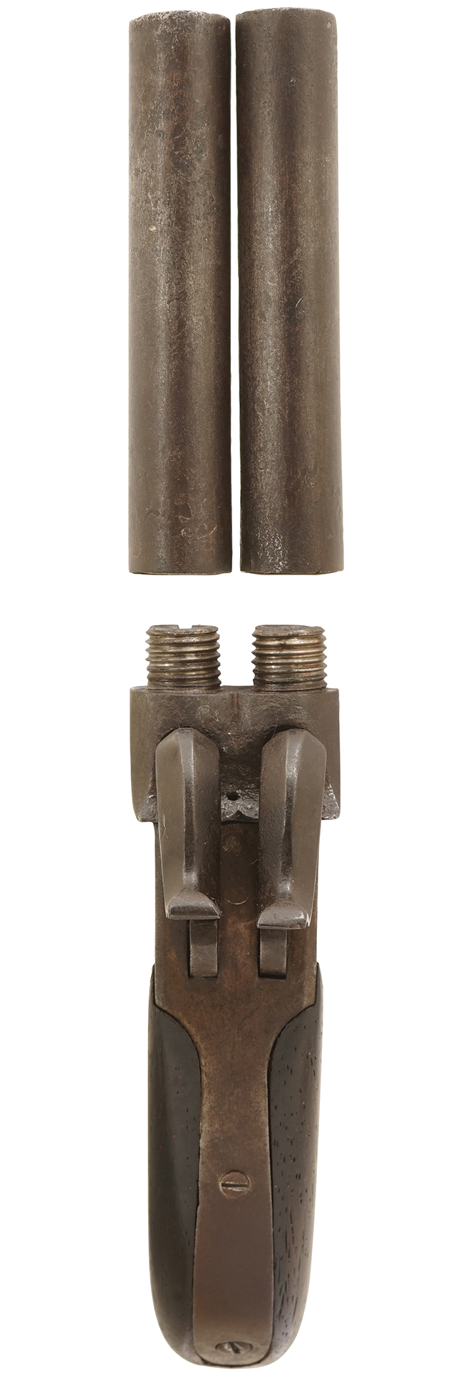 水平二連拳銃でありながら、左右の銃身が独立したターン・オフ・バレルとなっており、捻って取り外しが可能である点など、構造的にも面白い品です。 状態も良好で、各部の取り付けも非常にタイトでしっかりとした一品です。 一切装飾は施されていない、シンプルな中にも作域の良さが感じられる品です。 内部構造は殆ど使われていなかったと思われるほど完全な状態です。 ハンマーのメイン・スプリングについてもオリジナルで、左右が独立したスプリングとなっている一般的な水平二連拳銃とは異なり、左右のスプリングが一体となった特殊な形状となっています。 (MM)(KK)