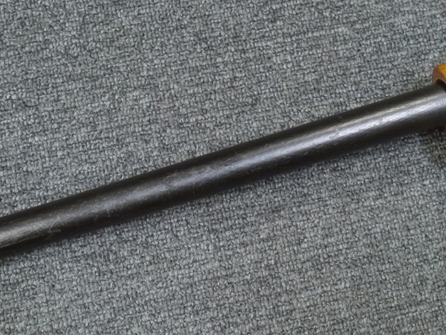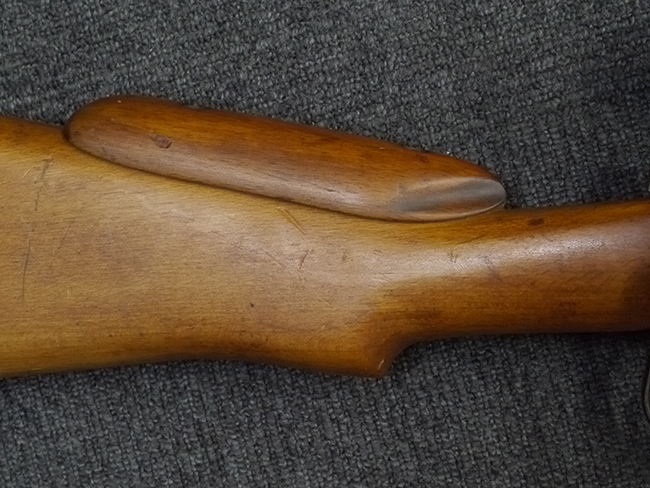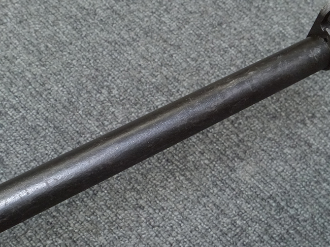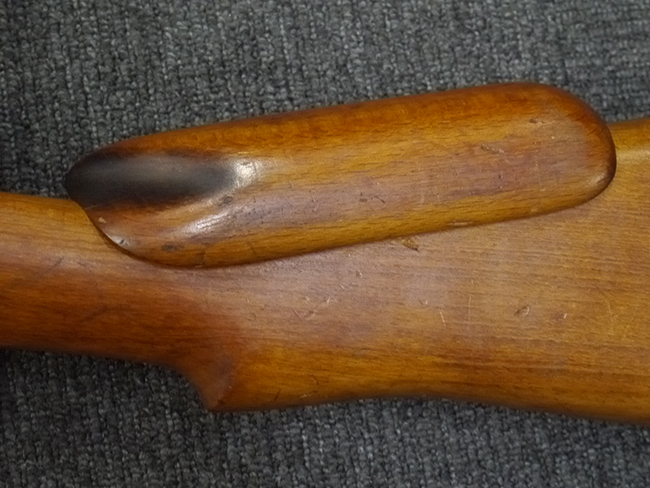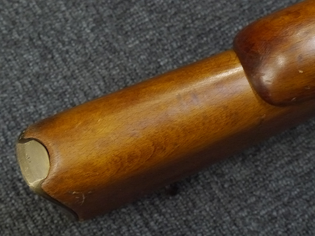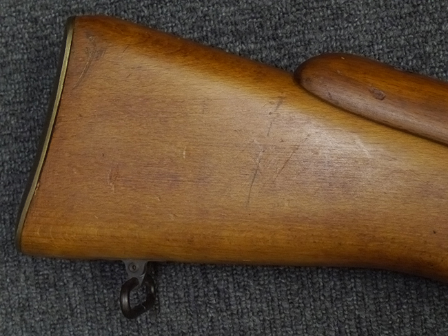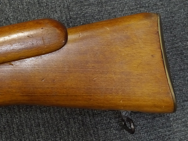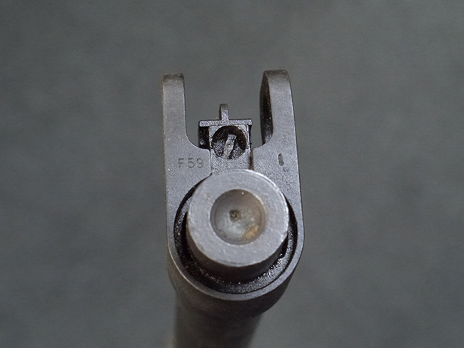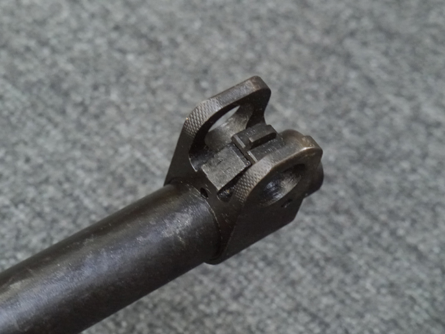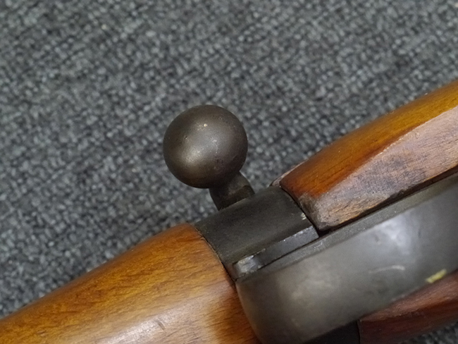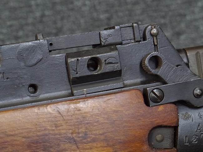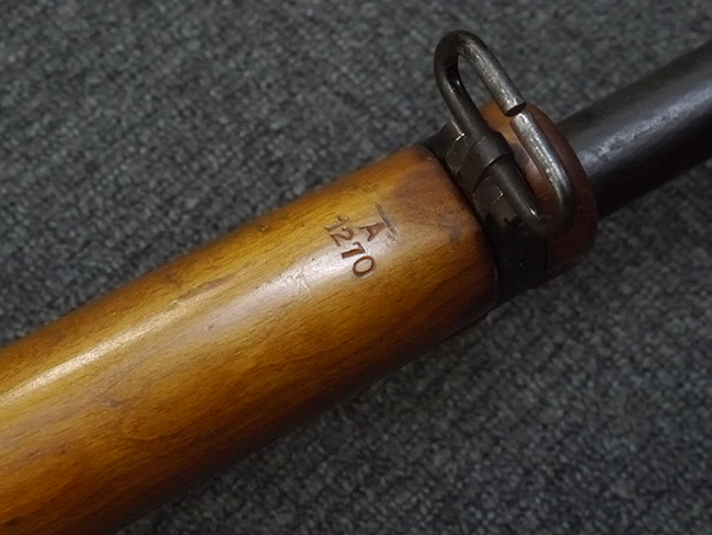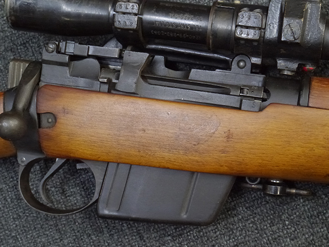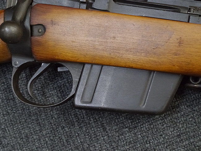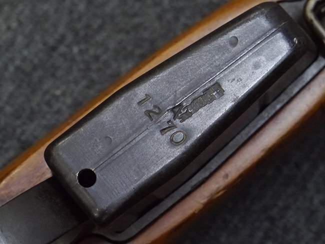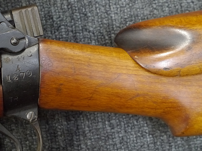 本品の銃身と機関部は戦後の英軍小火器の特徴であるBritish Black仕上げと呼ばれる皮膜の強い特殊な黒色塗装になっており、角部を中心にに若干の剥落や擦れこそ見られますが、概ね良好な状態が保たれています。 ハンド・ガードや前後銃床、チーク・ピースといった木部についても若干の打ち傷を除いて大きな欠損等は見受けられず、こちらも総じて良好なコンディションが保たれています。 各部の色合いは全体として明るい色味でマッチしており違和感はありません。 バット・プレートは真鍮製で、僅かに打ち傷が見られますが、ストックとのサイズも合っています。 また、ストック内コンパートメントの蓋の開閉についても問題なく行う事が可能です。 付属のマガジンは7,62mm×51 NATO弾に対応したタイプで、銃本体に装着した際に付いた擦れが見受けられるものの、大きな変形等は見受けられず、本体への着脱についても問題なく行う事が可能です。 マガジン底面には銃本体とマッチしたシリアルNo.A1270が打ち直しにより打刻されています。 スプリングとフォロアーが残っていますが、フォロアーの前端が少し削られて1cm程短くなっています。 リア・サイトの起倒・調整についても問題ありません。