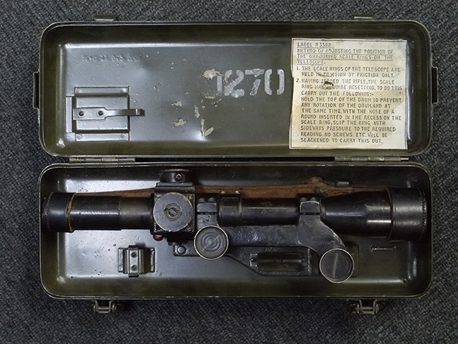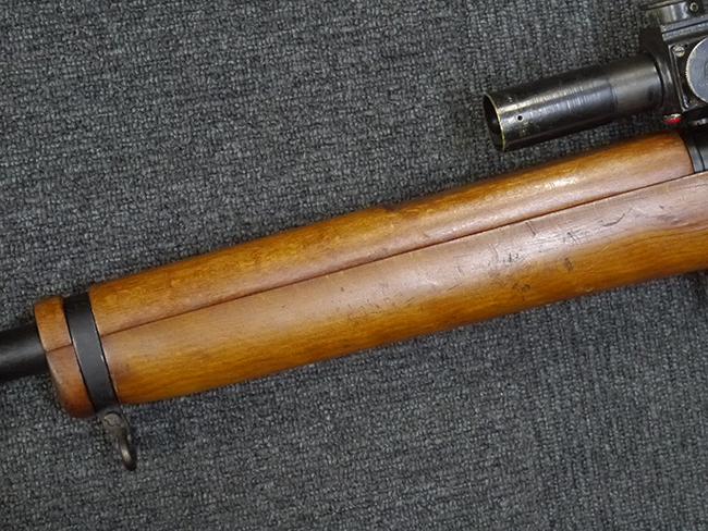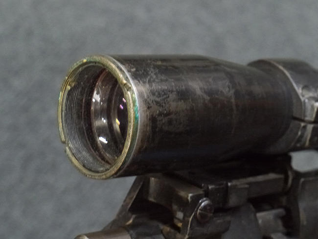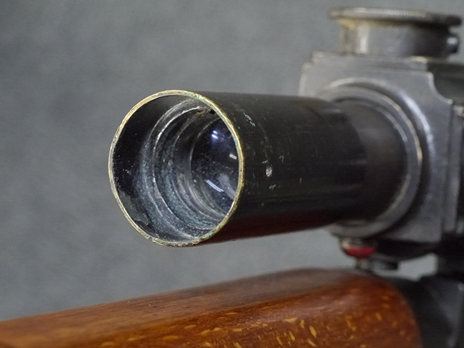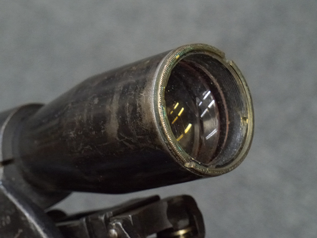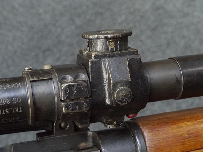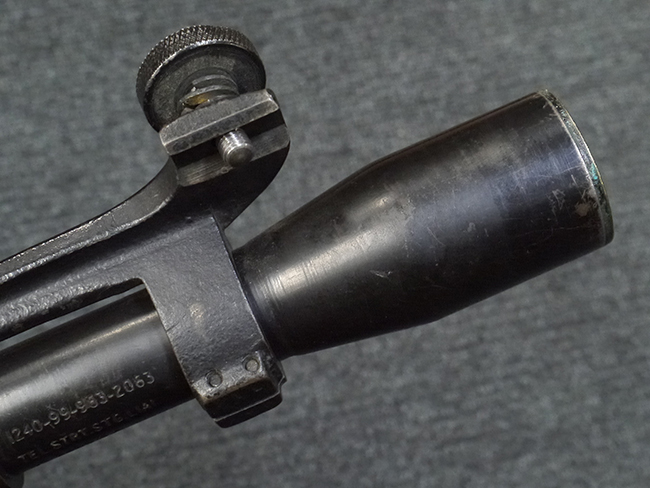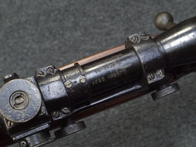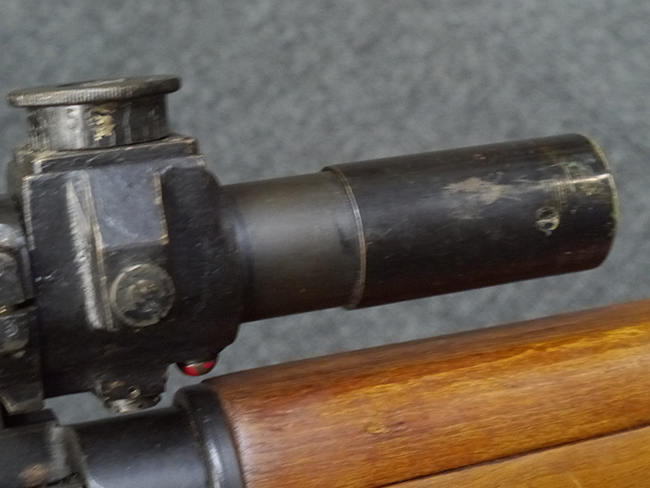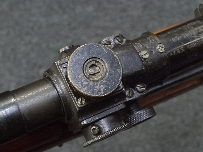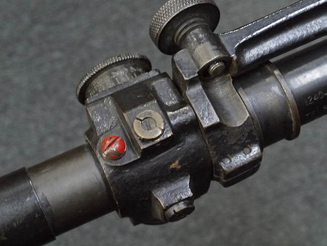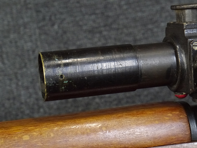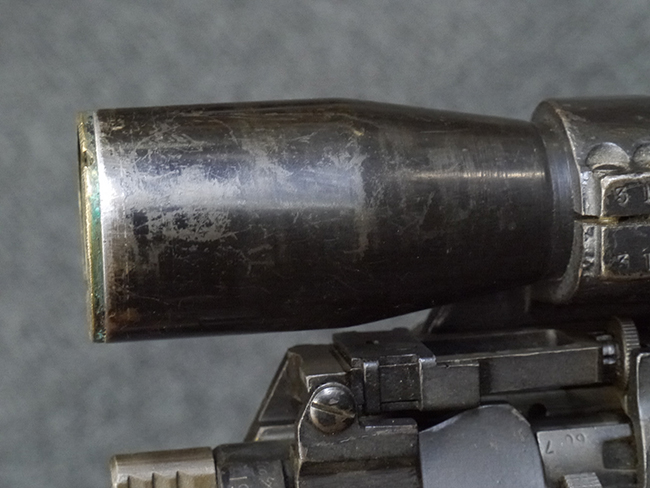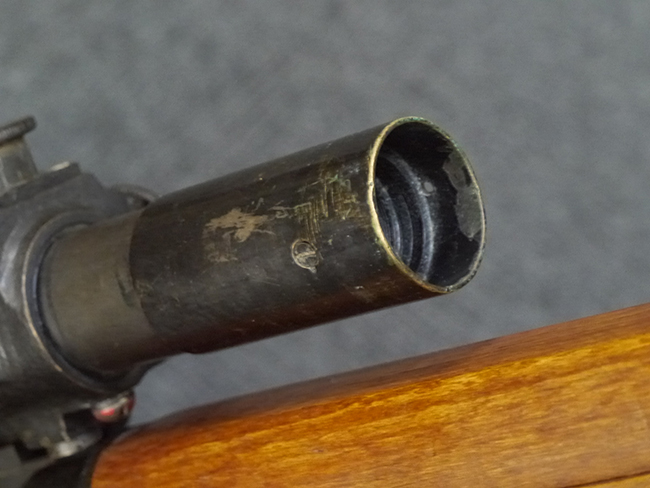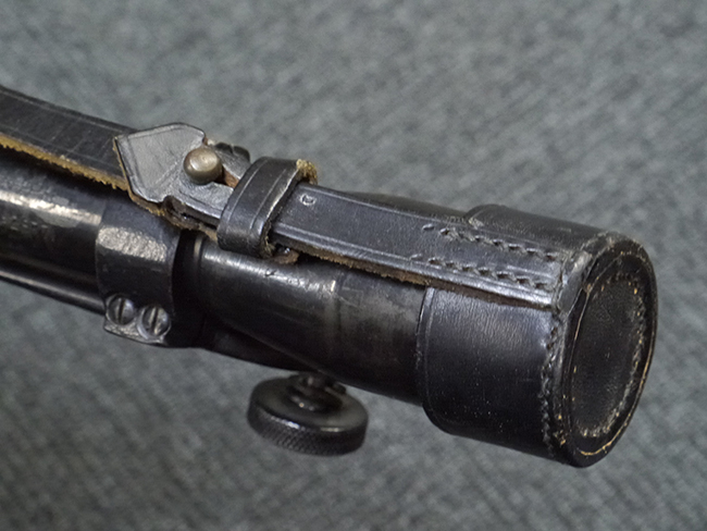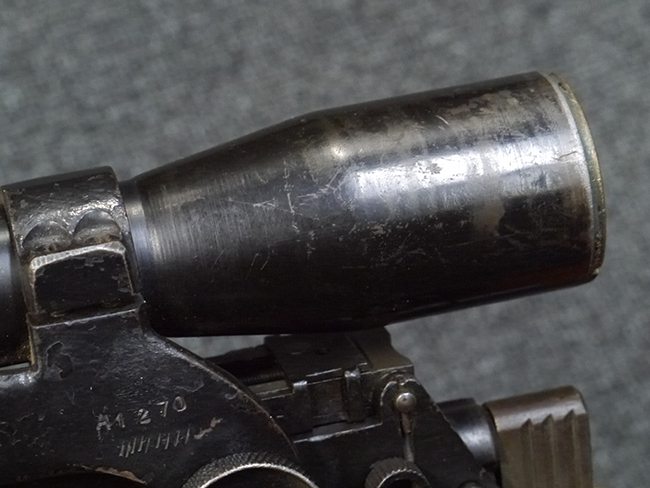 付属のNo.32スコープについては、スコープ本体のシリアルNo.が再整備時の打ち直しにより28771、マウントについても打ち直しによりA1270となっています。 スコープは外装にやや使用感が見られ、黒焼付塗装の一部に剥がれが見受けられるものの、視野は非常にクリアで目立った曇りや塵等は見られません。 後側のスコープ固定用ノブに僅かな歪みが見られが、スコープ自体は問題なく固定することが可能です。 本品には銃本体に加えて金属製スコープ・ケース、革製レンズ・カバーが付属します。