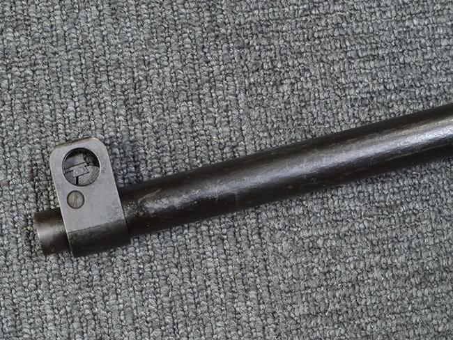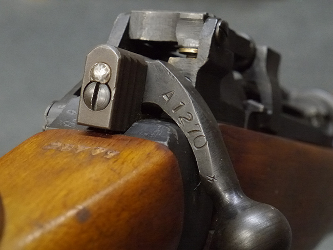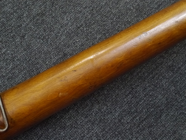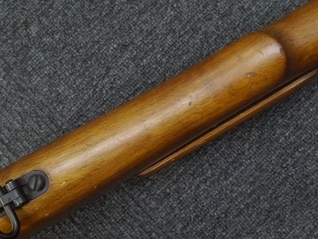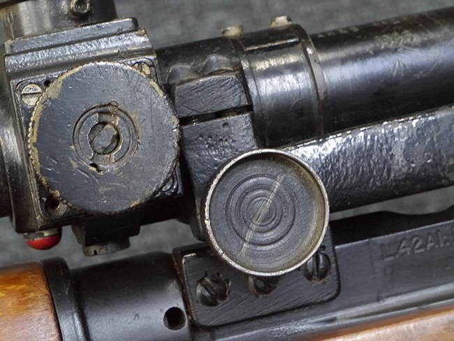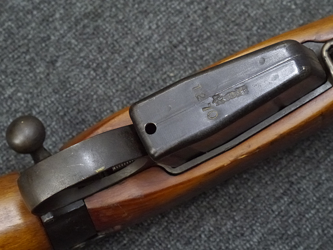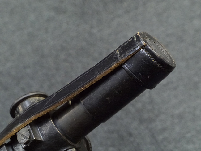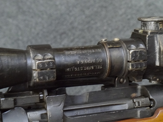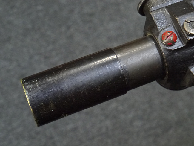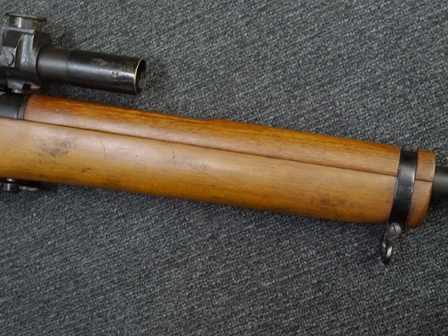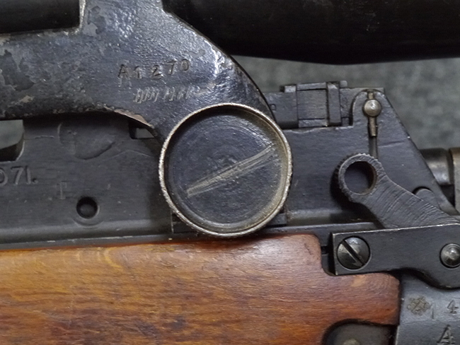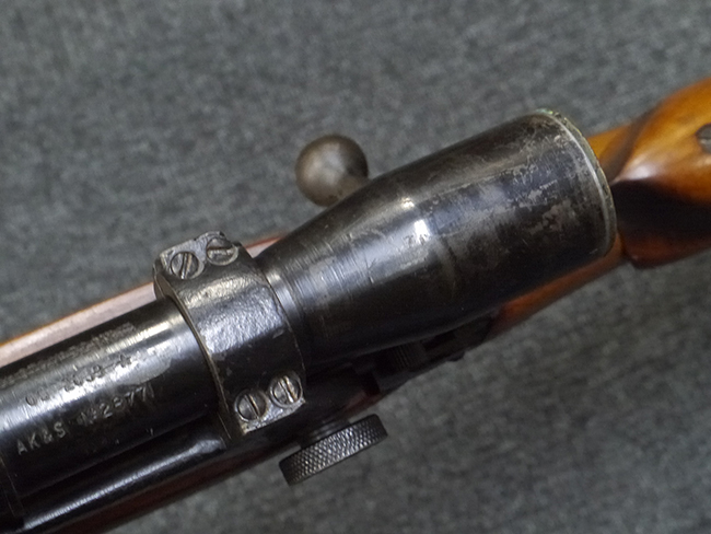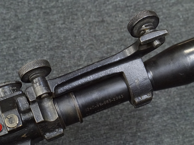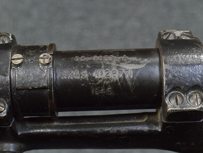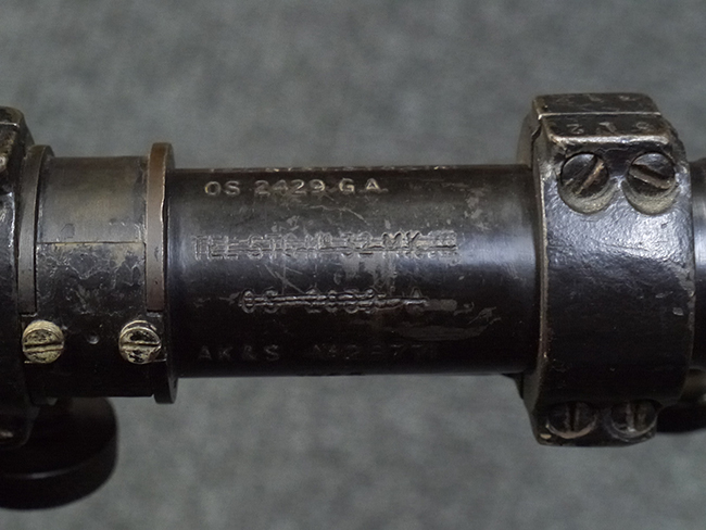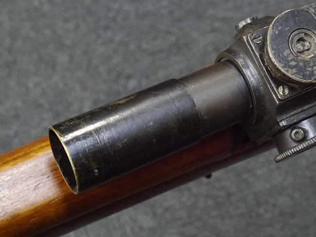 付属のNo.32スコープについては、スコープ本体のシリアルNo.が再整備時の打ち直しにより28771、マウントについても打ち直しによりA1270となっています。 スコープは外装にやや使用感が見られ、黒焼付塗装の一部に剥がれが見受けられるものの、視野は非常にクリアで目立った曇りや塵等は見られません。 後側のスコープ固定用ノブに僅かな歪みが見られが、スコープ自体は問題なく固定することが可能です。 本品には銃本体に加えて金属製スコープ・ケース、革製レンズ・カバーが付属します。