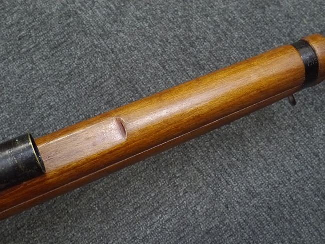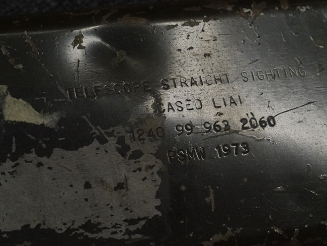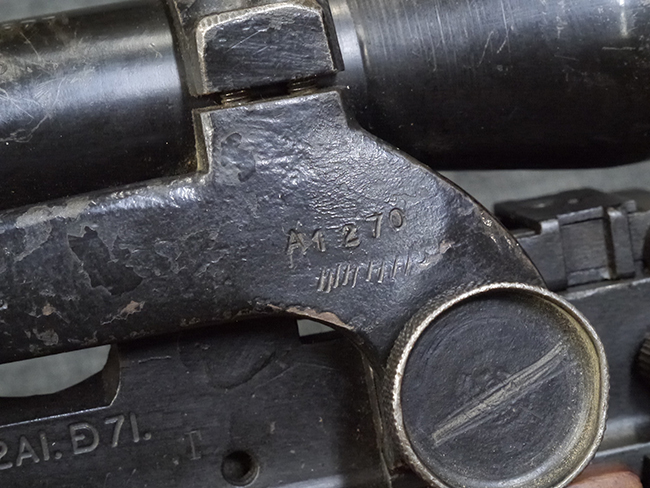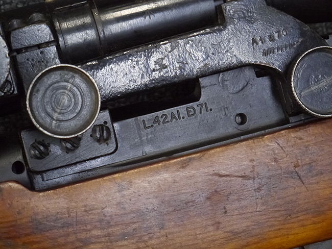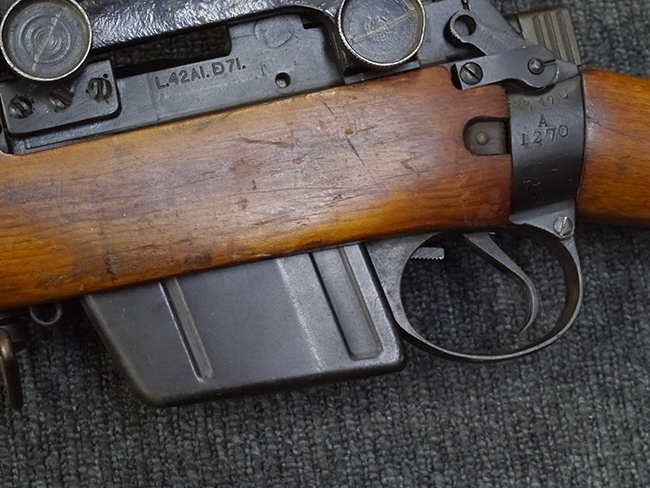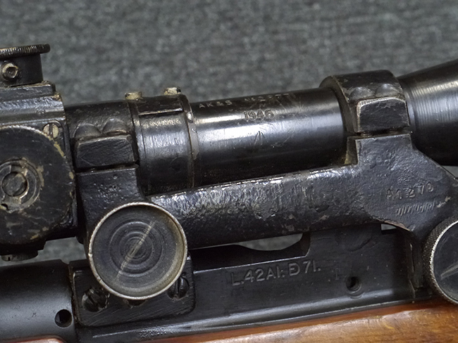 本品の機関部左側面には「L.42A1.D71.」の刻印が入っており、1971年にEnfield 造兵廠で製造された事が窺えます。 バット・ソケット左側面にはシリアルNo.に加えてBSA Shirley工場を示す「M47C」の刻印の他、Holland & Hollandにより狙撃仕様に改修される前の最終検査刻印である「TR」の刻印が見られます。
