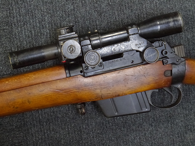 1970年にイギリス軍制式となったボルト・アクション式のスナイパー・ライフルです。 英国では1957年にNATO標準弾薬の7,62mm×51弾を使用するFAL L1A1自動小銃がリー・エンフィールド No.4 小銃の後継として採用されると、ロイヤル・スモール・アームズ・ファクトリー・エンフィールド (Royal Small Arms Factory, Enfield) において既存のNo.4 Mk1 (T) 及びNo.4 Mk1* (T) 狙撃銃の使用弾薬を.303ブリティッシュ弾から7,62mm×51 NATO弾に変更する改修が行われました。 この改修には7,62mm NATO弾に対応した鍛造製ヘビー・バレルへの変更の他、フォア・エンド及びハンドガードの短縮が含まれており、1970年から71年にかけて約1,080挺が改修されました。 既存の.303ブリティッシュ用の銃身のライフリングが5条左回りであったのに対し、L42A1狙撃銃用の新しい銃身は4条右回りとなっています。 また、No.4 MkI (T) 狙撃銃で問題となった銃身と銃床のフォアエンドへの接触に伴う精度への影響を抑える為、銃身はフリー・フローティング方式となっています。 装着される3.5倍のNo.32スコープも再整備され、使用弾薬の変更に伴う弾道の変化に対応する為、エレベーション・ドラムが変更されています。 マガジンについても7,62mm×51 NATO弾に対応した物へと変更され、マガジン・リップの突起がエジェクターとして機能するようになりました。 尚、.303ブリティッシュ弾用のエジェクター・スクリューはそのまま残されています。 (KK)