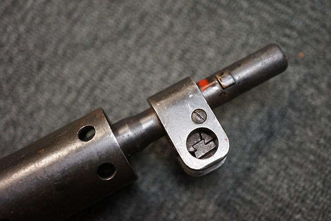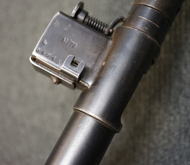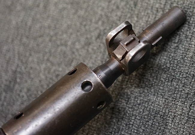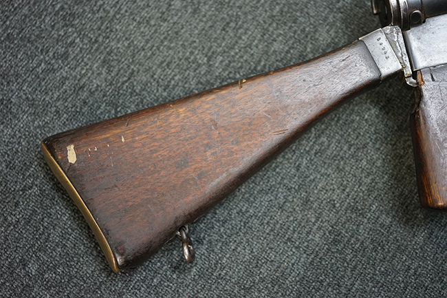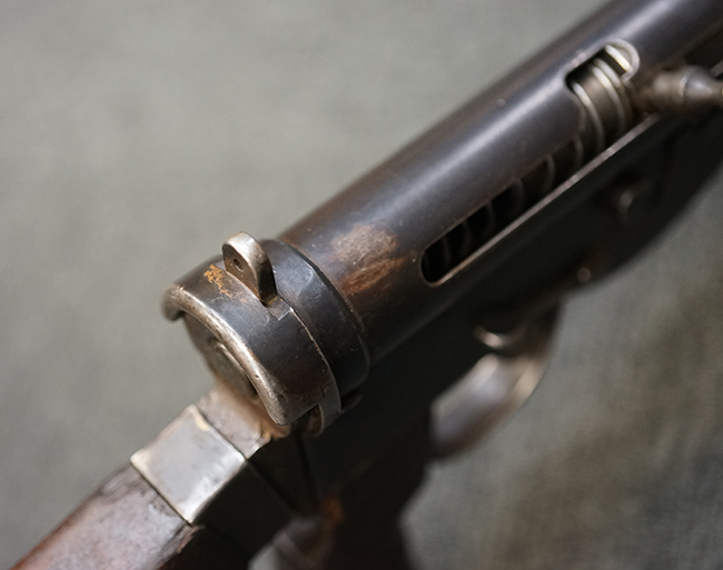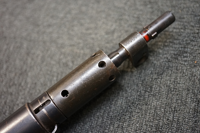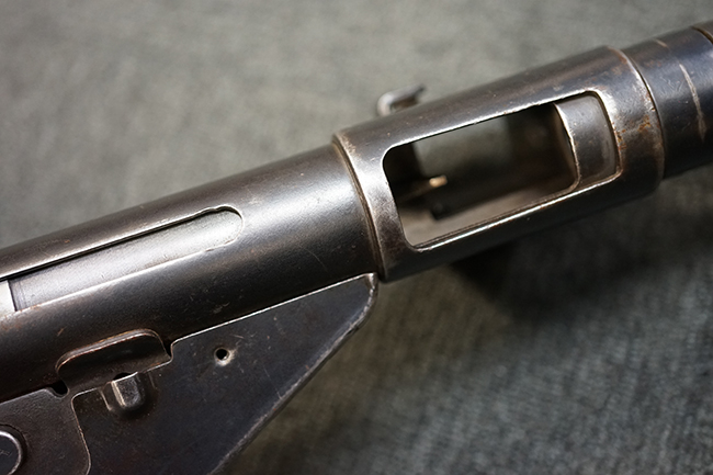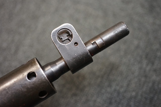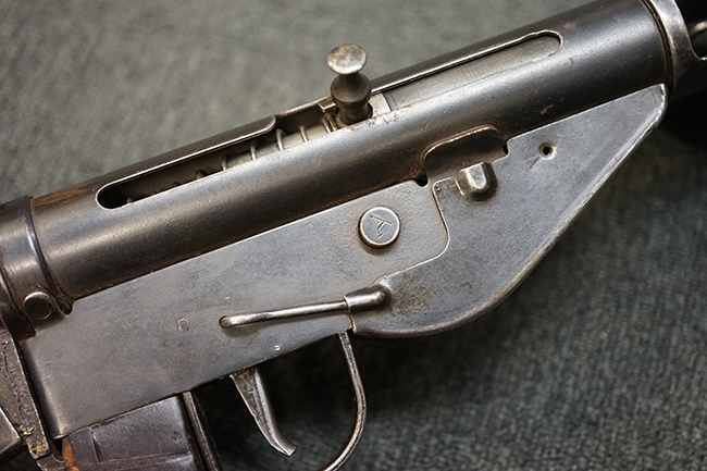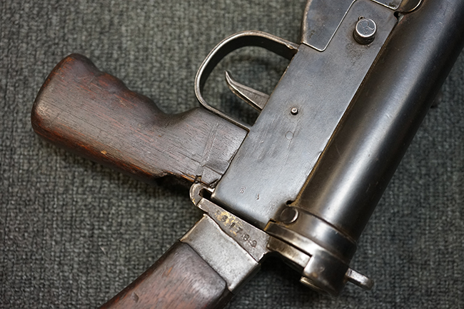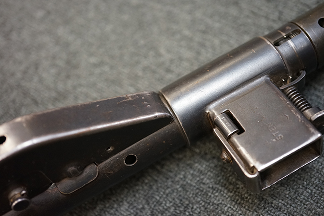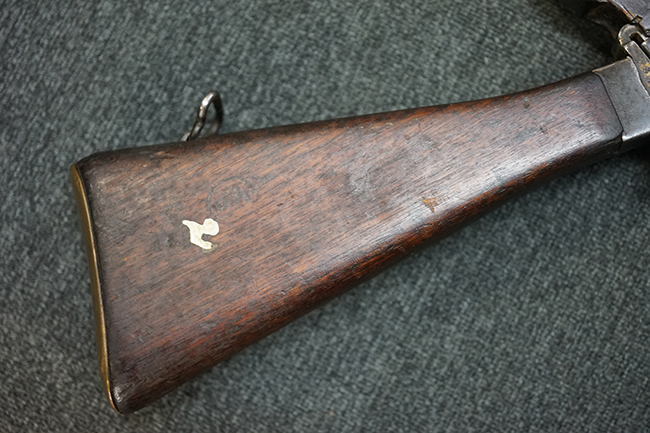本品のシリアルNo.は54843の品で、金属部はブルー仕上げとなっています。適度な使用感があり、小傷が散見される他、角張った部分などが擦れて地金っぽくなっていますが、大部分にブルーが残っておりおおむね良い状態と言えます。 銃口付近には赤い塗料が若干付着しております。 ストック基部やフロント・サイト・ポストのシリアルは一致していません。 やや暗い色合いのストックとグリップの木部は色合いが揃っており、全体の小傷の他縁の当たりの小さな欠けが散見されますが、しっかりした状態です。 またグリップの左右の基部に補強の継ぎ木がしてある仕様となっています。 これはMk Vのグリップに多く見られるもので、Mk Vらしさでもあります。 真鍮製のバット・プレートは、時代の付いた良い雰囲気となっています。 セーフティは可動しますが、トリガーとの連動はありません。 またマガジン挿入口は回転し保管状態にすることが可能です。 全体的に使用感がありつつ保存状態が良い点で統一感のある良い個体です。 マガジンはブルー仕上げで小さな凹みもありますが、大きな変形は見られず着脱もスムーズです。尚、マガジン・スプリングは入っていません。