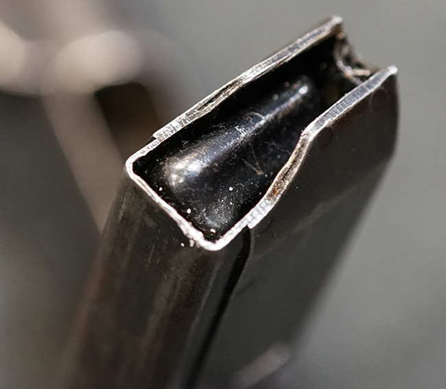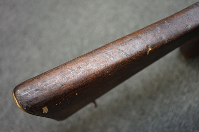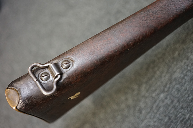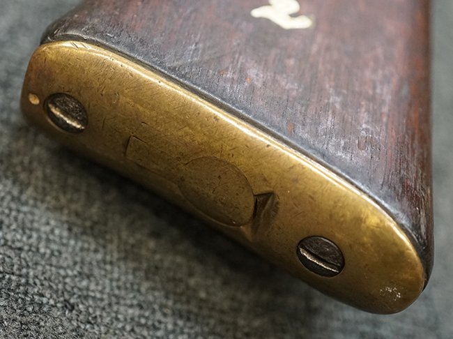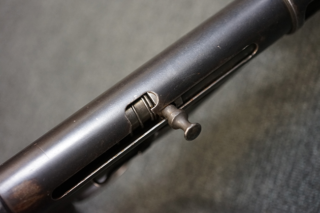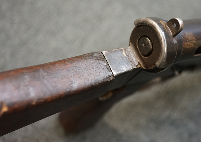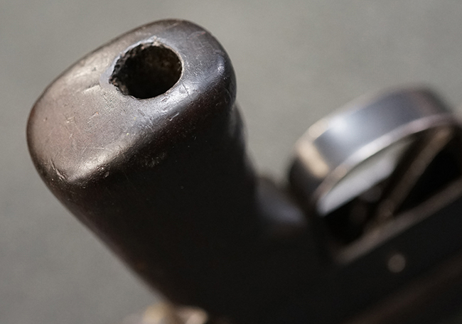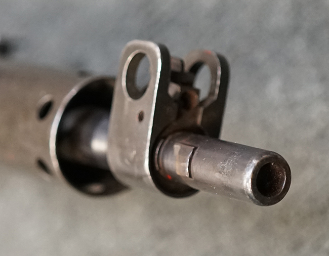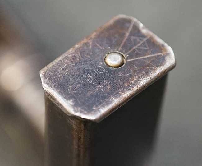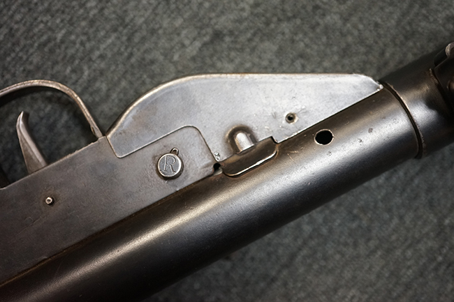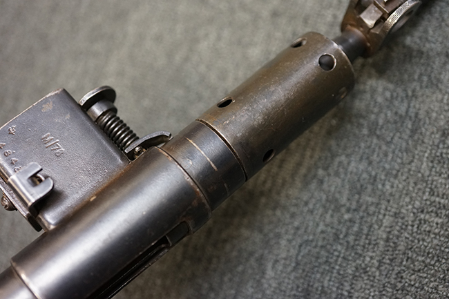 本品のシリアルNo.は54843の品で、金属部はブルー仕上げとなっています。適度な使用感があり、小傷が散見される他、角張った部分などが擦れて地金っぽくなっていますが、大部分にブルーが残っておりおおむね良い状態と言えます。 銃口付近には赤い塗料が若干付着しております。 ストック基部やフロント・サイト・ポストのシリアルは一致していません。 やや暗い色合いのストックとグリップの木部は色合いが揃っており、全体の小傷の他縁の当たりの小さな欠けが散見されますが、しっかりした状態です。 またグリップの左右の基部に補強の継ぎ木がしてある仕様となっています。 これはMk Vのグリップに多く見られるもので、Mk Vらしさでもあります。 真鍮製のバット・プレートは、時代の付いた良い雰囲気となっています。 セーフティは可動しますが、トリガーとの連動はありません。 またマガジン挿入口は回転し保管状態にすることが可能です。 全体的に使用感がありつつ保存状態が良い点で統一感のある良い個体です。 マガジンはブルー仕上げで小さな凹みもありますが、大きな変形は見られず着脱もスムーズです。尚、マガジン・スプリングは入っていません。