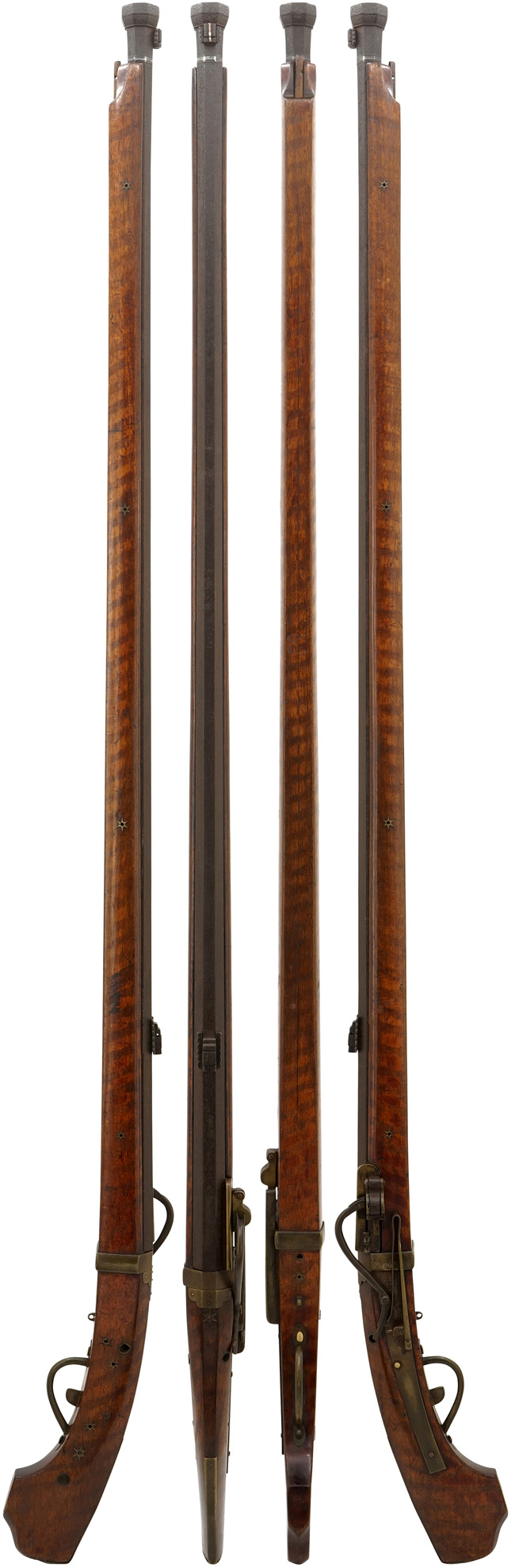 胴金の幅は阿波筒は比較的広い22mm前後が一番多く、本品の幅は20.5mmと阿波筒としてはやや狭めです。胴金後部の飾り金具はシンプルで小さな「花先形(雲形とも言う)」で彫刻はありません。芝引金は飾り気のないとても長い短冊形で取れないように両縁をL字に曲げてあり、芝引金に続く尾床板は上部で盾を逆さにしような形(他国の剣先形より幅広で根元が絞っていない)で芝引金と一体になっています。 台 (銃床) についても台カブ部分が大きく、美しい虎杢が人工的に入れられており、目釘金に六稜の星形の座金が用いられている点など、総じて阿波筒の特徴を押さえた作りとなっています。 銃床には火縄通しの穴及び火縄消しの穴が設けられています。