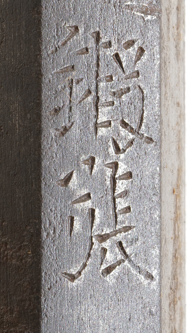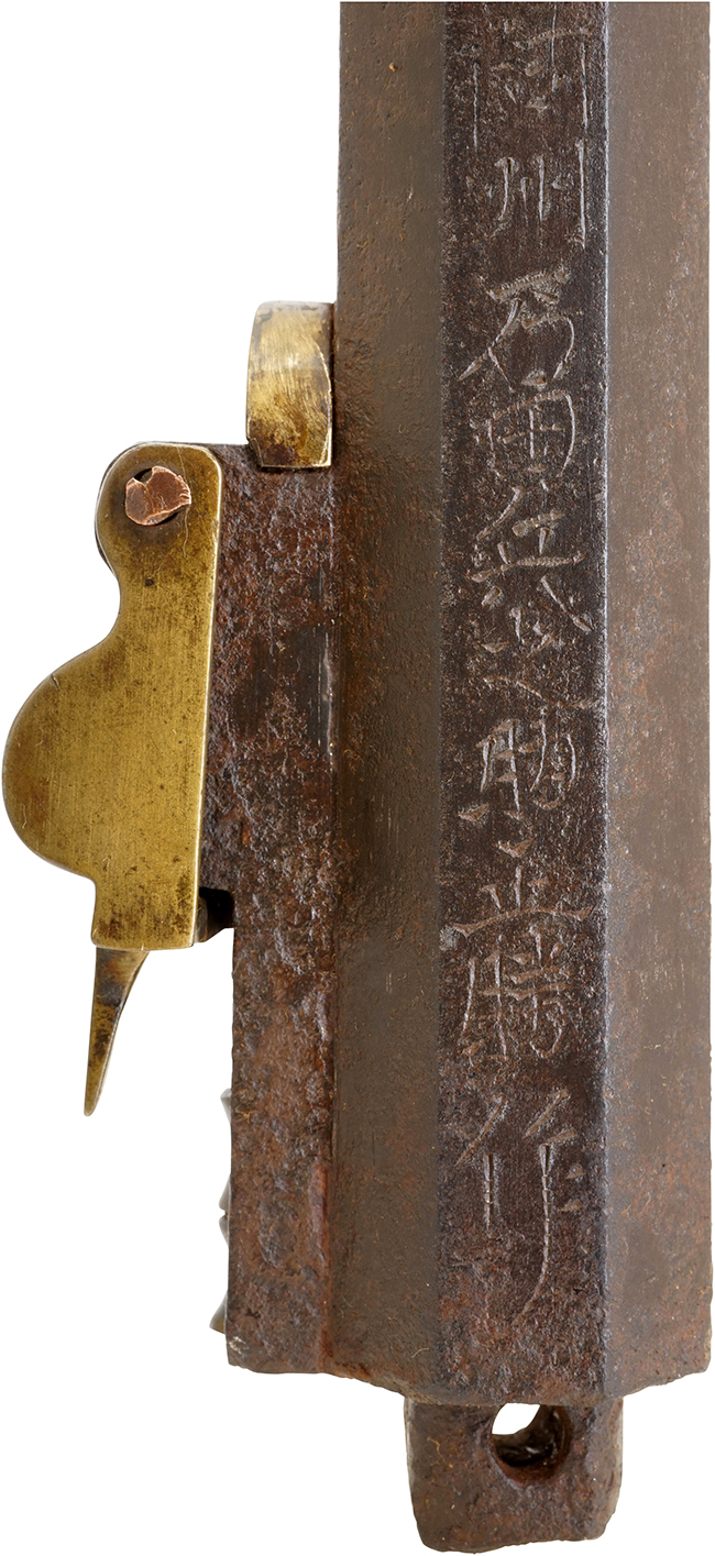 本品は阿州の在銘品で、銃身下面に「鍛張 阿州石田兵之助正勝作」の銘が入っています。 「石田兵之助正勝」を含む石田一門は、阿波国で活動した二大鉄砲鍛冶(石川家と石田家)の名門家系です。 「石田兵之助正勝」については、「全国鉄砲鍛冶銘鑑」P.24及び「全国鉄砲鍛冶銘地域別分類」P.305にその銘が掲載されています。