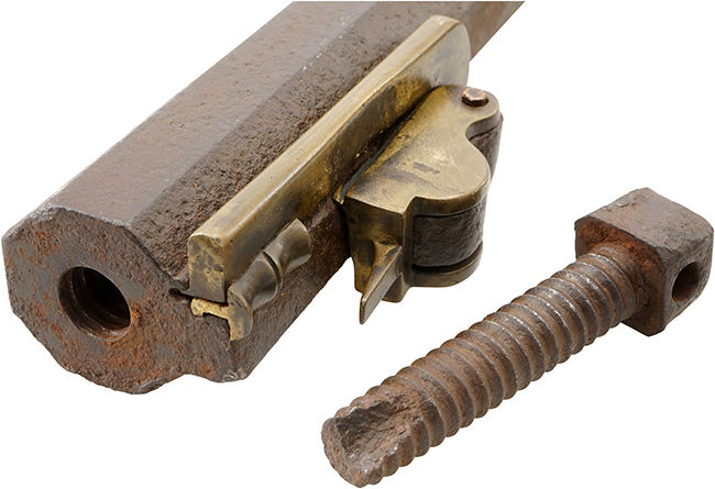 カラクリの作動については完全で、火挟を起こした際のロックはしっかりと掛かり、引金を引くと火挟がスムーズに落ちます。 銃身内は銃口から銃身後部まで完全に抜けて (通って) おり、火穴も抜けています。 尾栓の取り外しについてもスムーズに行う事が可能です。 火蓋の開閉についても問題有りません。