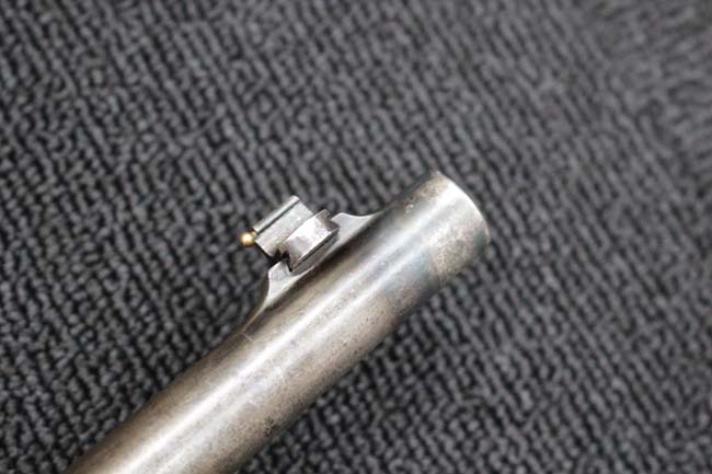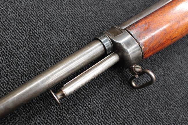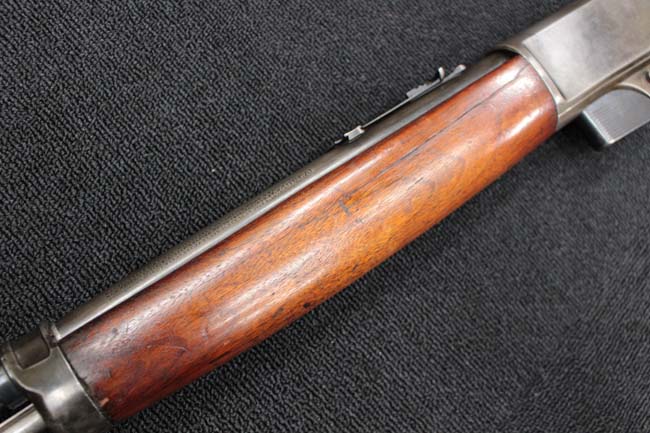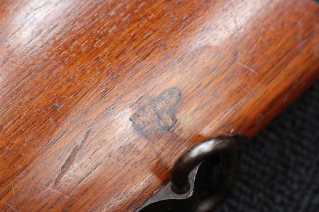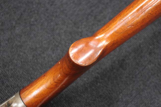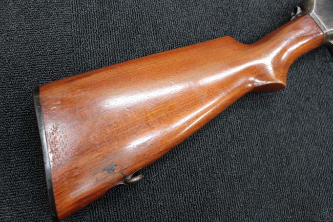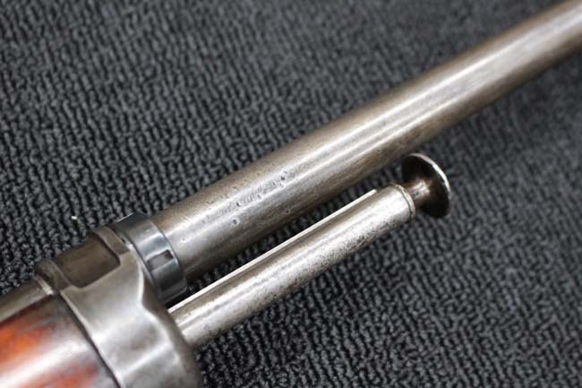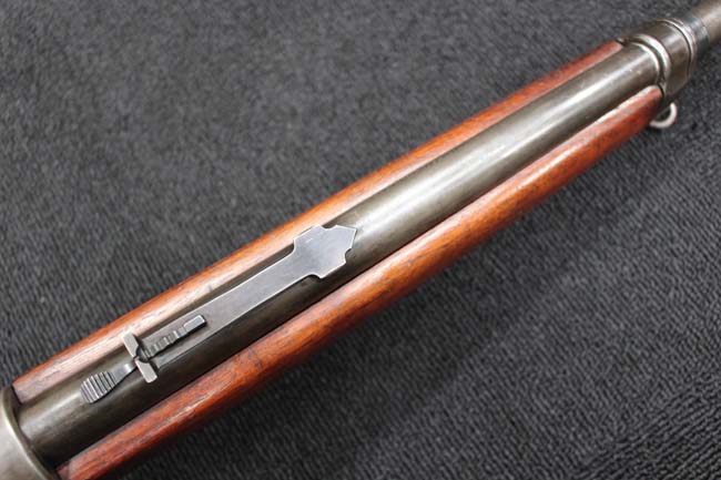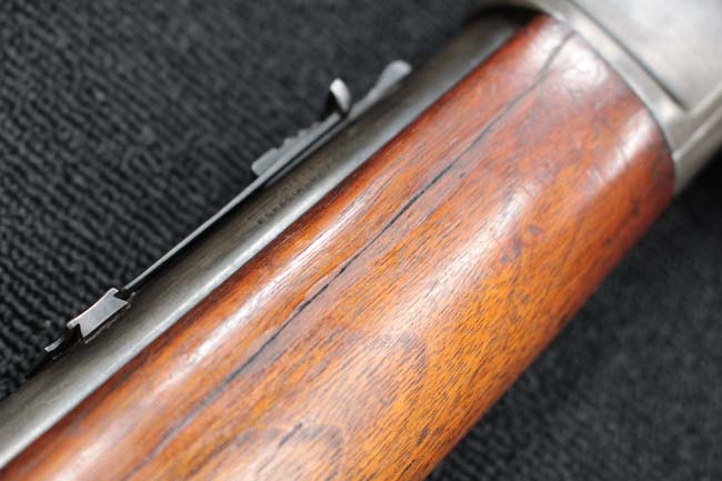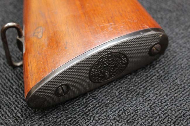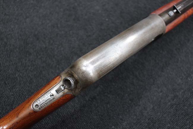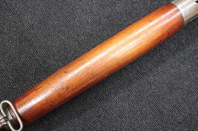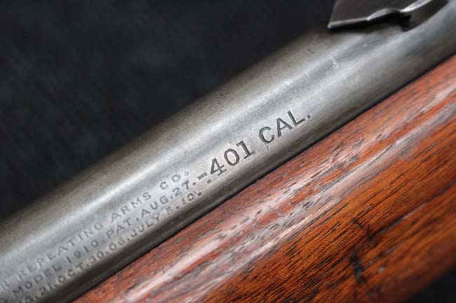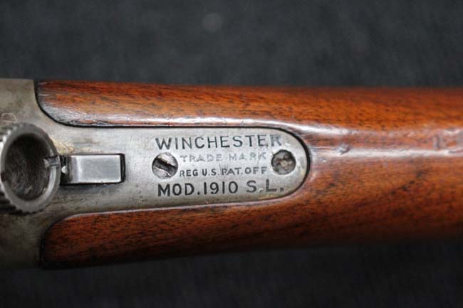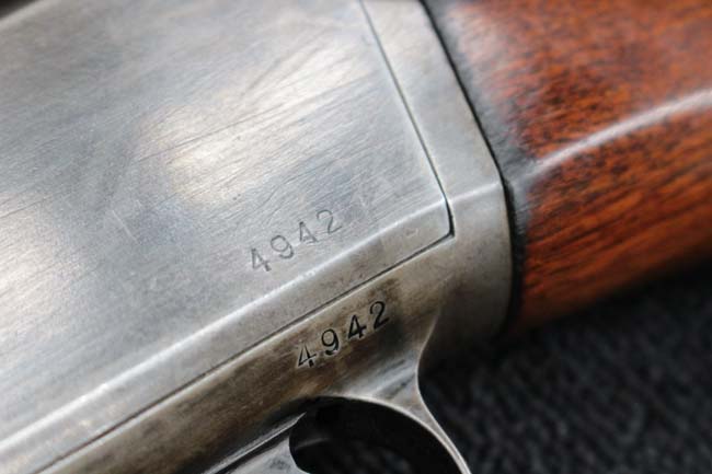 本品のアッパー・タング上面には「WINCHESTER」の刻印に加えて「MOD. 1910 SL.」のモデル名刻印が入っています。 また、銃身にはウィンチェスター社製を示す刻印に加えて「.401 CAL.」の刻印が入っています。 本体左側面及びトリガー・ハウジングには4942の刻印が入っており、シリアルNo.から1911年に製造された事が判ります。