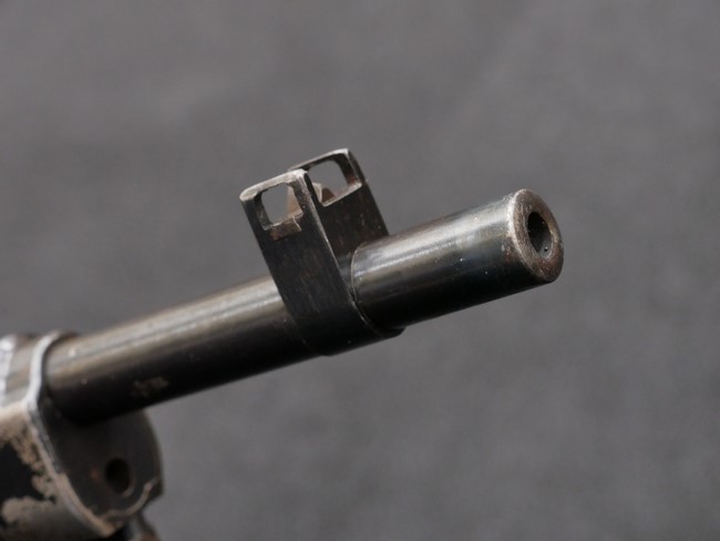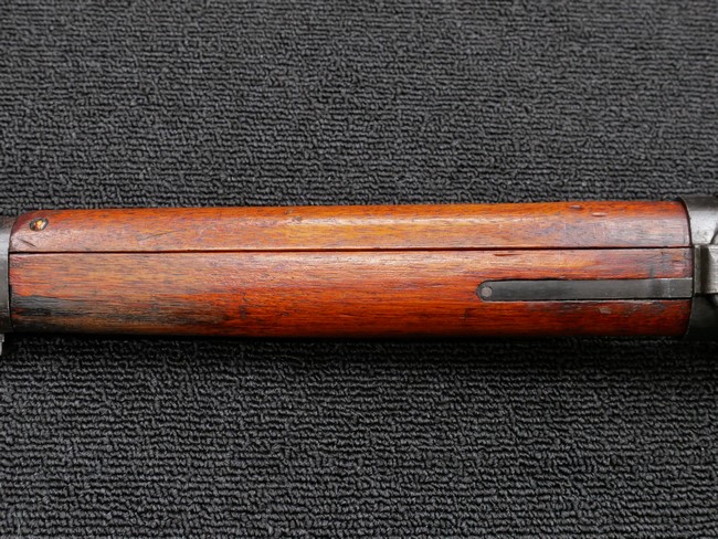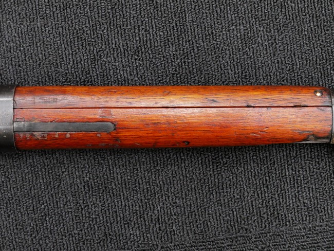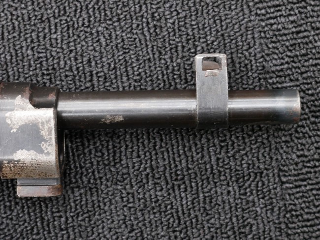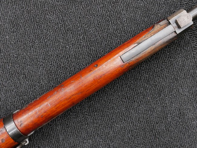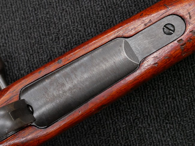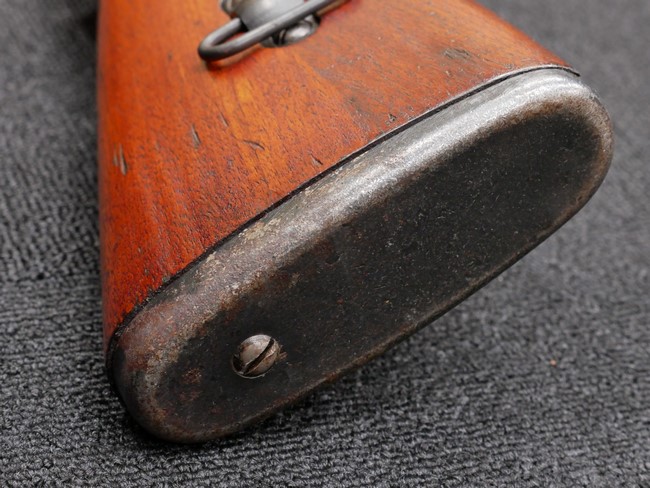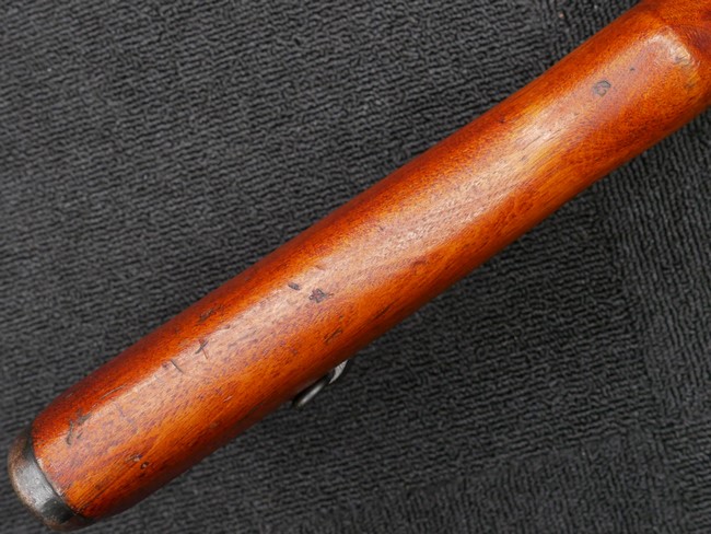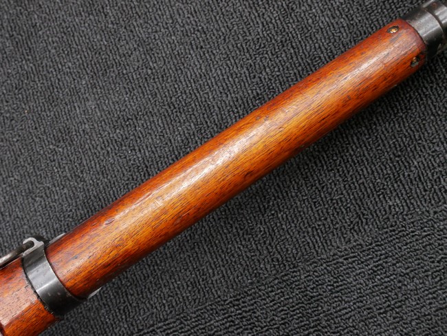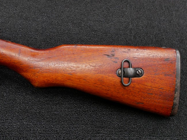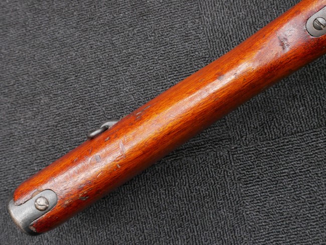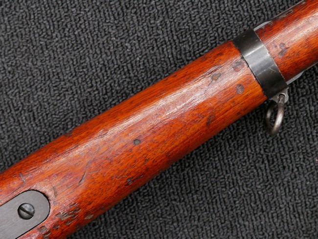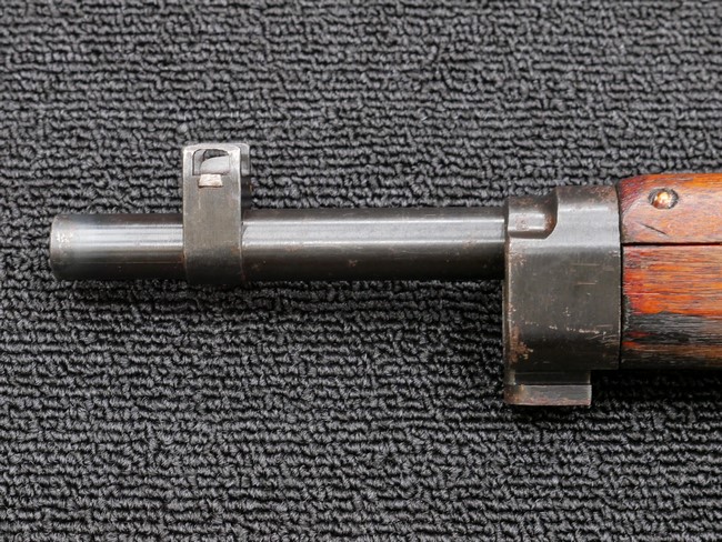 本品の金属部は、やや擦れや経年による褪色の他、銃身や機関部、照尺、安全子等にやや表面錆や朽ち込み痕が見受けられますが、全体としては大きな欠損は見受けられず、概ねしっかりとした状態が保たれています。 フロント・バンド右側面に仕上げが落ちている箇所が見受けられますが、全体としては大部分の仕上げは残っています。 照星のガード部分についても、やや朽ち込みが見られるものの、現状目立った変形は見受けられません。 木部については、やや打ち傷や線傷などが散見され、フロント・バンド付近にやや大きな割れが見受けられますが、他に大きな割れや欠けは見られず、オリジナルの仕上げも大部分に残っています。 銃床上下の継ぎ目についても、現状目立った隙間やがたつき等は見受けられません。 傷み易い床尾板については、全体に仕上げが薄くなり、時代錆や表面錆痕が表れていますが、目立った変形等は見られず、銃床への取り付けもがたつきもなくしっかりとしています。 照尺の既倒・調整や弾倉底板の着脱については問題なく行う事が可能です。 弾倉内の弾受 (フォロワー) 及び撥条は入っています。