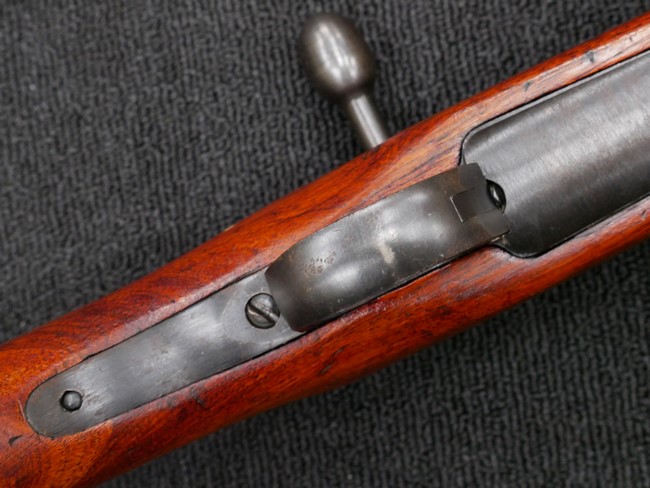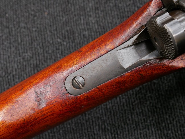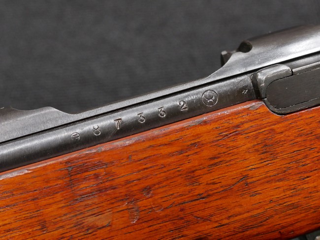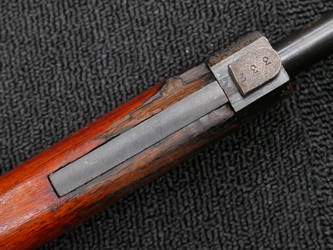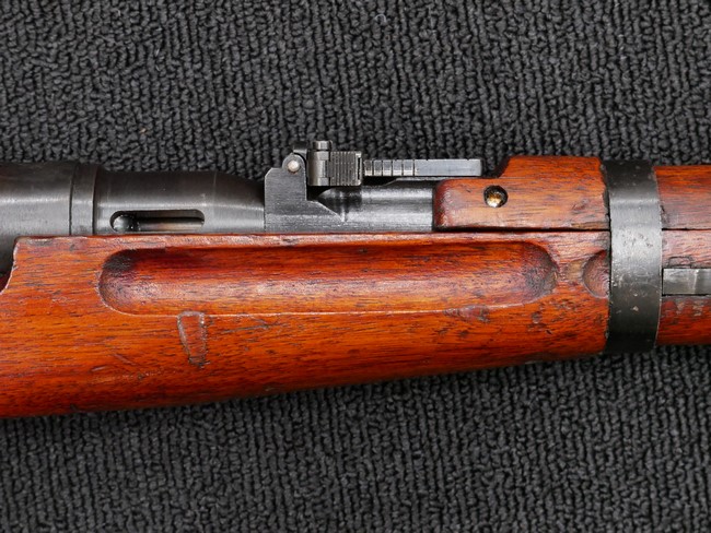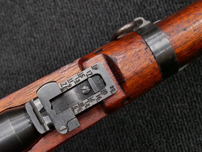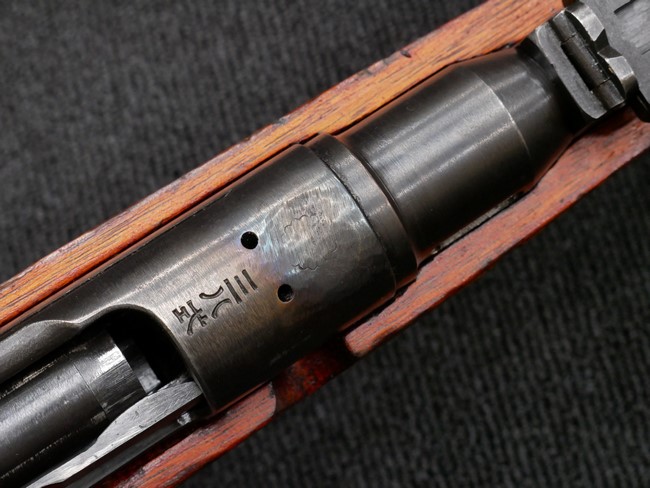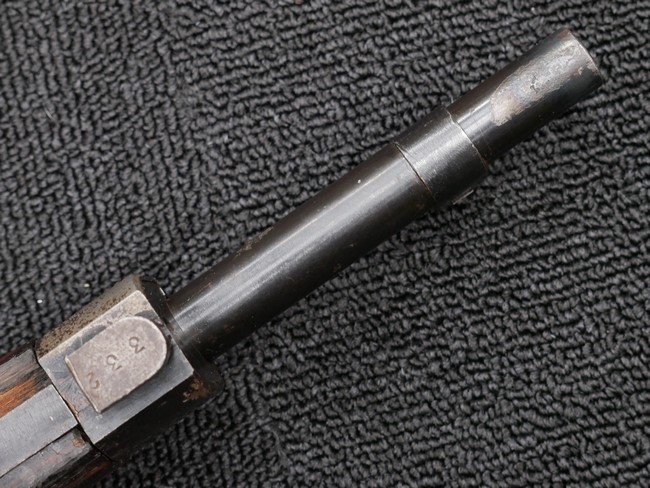 本品のシリアルNo.は87332で、機関部左側面にはシリアルNo.及び名古屋工廠製を示す刻印の他、<二> のシリーズ刻印が入っています。 床尾下部には一部薄くなっているものの、名古屋工廠の「名」と名古屋工廠千種製造所検査刻印の「チ」の検査刻印が入っています。 その他、上帯下部及び弾倉底板 (内部) に機関部とマッチした「332」の番号が入っています。 「三八式」の刻印がはっきりと残っています。 薬室上面の菊花紋章は輪郭の一部を残して削られており、周りには若干焼けによる変色が見受けられますが、大きな違和感などはありません。 照星は前中後期型に共通するガードが付いており、安全子は窪みの有る後期型、床尾板もカップ型の後期型です。 照門は前~後期共通のVノッチ型です。