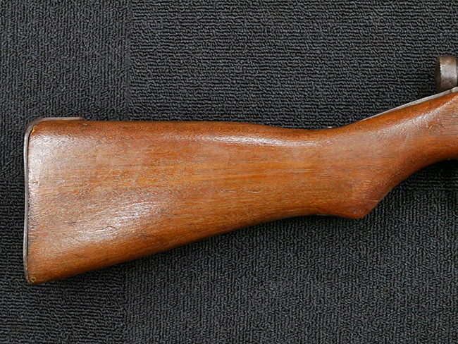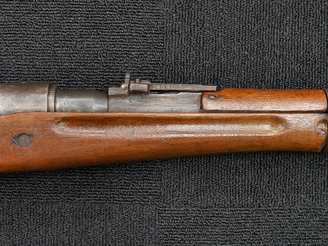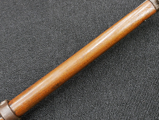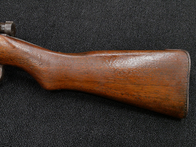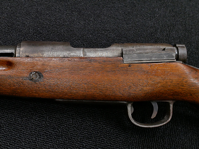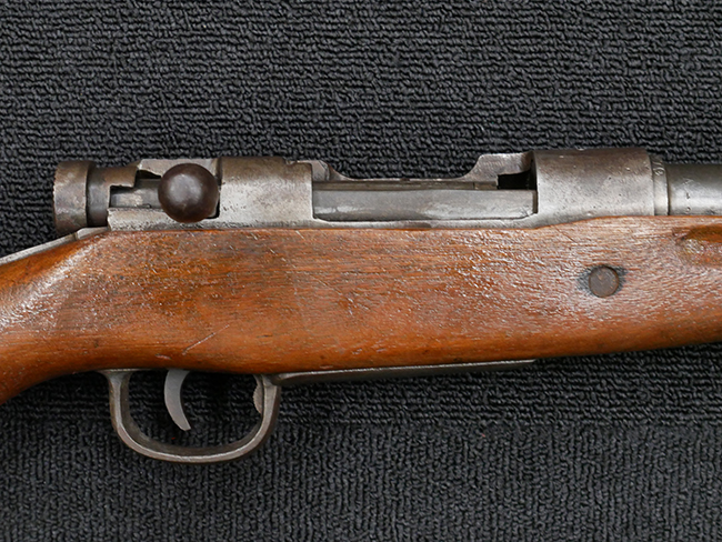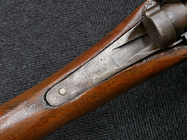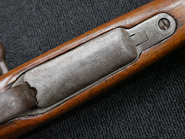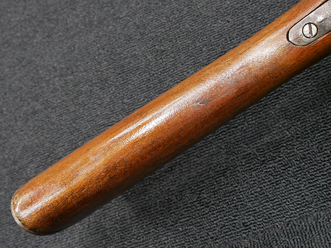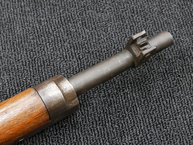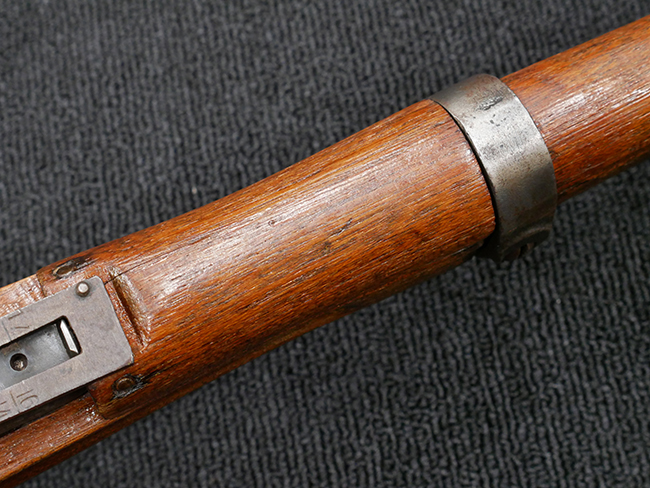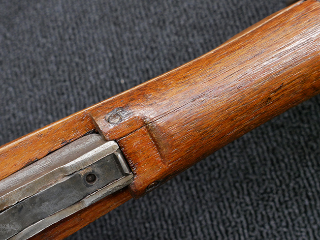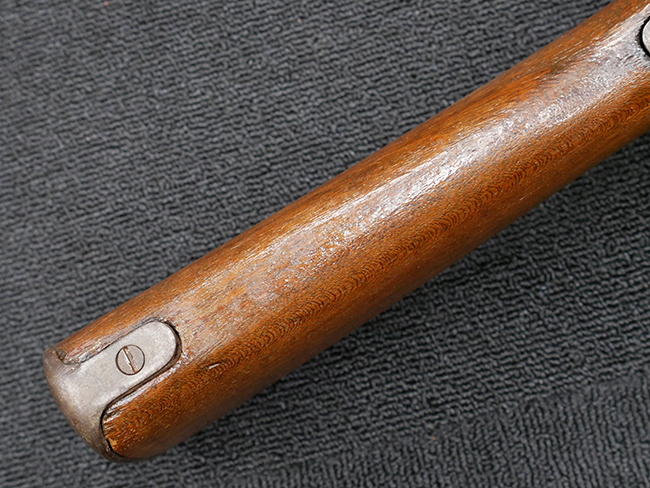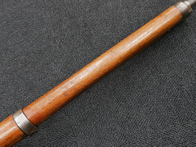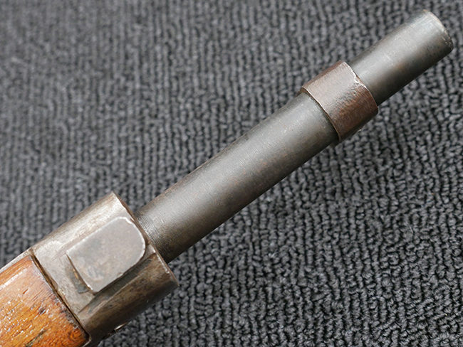 他の九九式で見ない形状の照尺のガードについても、変形や欠け等は見られません。 弾倉底板や独特な形状の用心鉄 (トリガー・ガード)、上帯にも擦れや薄錆などは見受けられますが、全体にコンディションは良好です。 木製銃床については、打ち傷や線傷が見受けられ、銃把下部に僅かな欠けも確認出来ますが他に大きな破損等は見られず、各部の取り付けもガタつき等は見られません。 下帯 (リア・バンド)や木被 (アッパー・ハンドガード) についても、確りとしていて遊びやガタつき等は見られません。 床尾板 (バット・プレート) 部分についても、擦れや錆などが見受けられるものの、目立った変形等は見られません。 銃床は一見旧軍小銃特有の銃床上下合わせのものに見えますが珍しい単材の銃床となっています。 照尺の既倒・調整、弾倉底板の開閉については問題なく行う事が可能です。 上帯にさく杖を入れるための穴は開いているものの深さは10mm程度で既存のさく杖を入れることは出来ません。 弾倉内の弾受 (フォロワー) 及び撥条は入っています。 安全子は押し込みながら回転させる事が可能です。