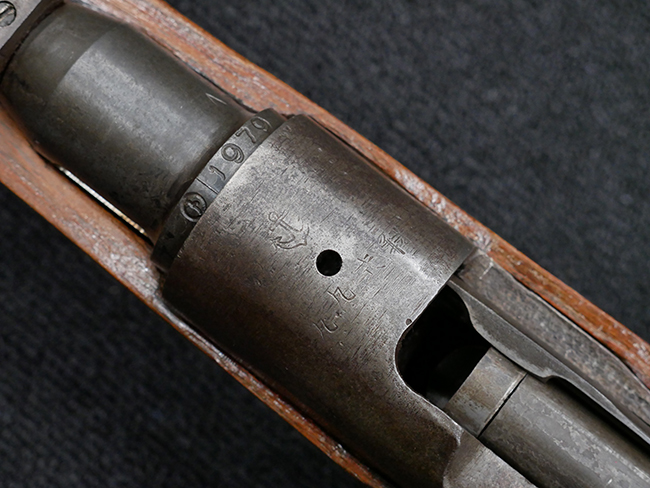 本品は九九式短小銃 初期/中期型の様な外見をした比較的初期の製造品で、横須賀海軍工廠製を表す〇に“ト"の表記や、通常菊花紋章が打刻されている位置に海軍の錨マーク、そして下には「九九式特」など独特な表記がされています。 また機関部左側面には1011のシリアルNo.が確認出来、薬室後端には〇に“ト"や1979などの刻印も見ることが出来ます。
