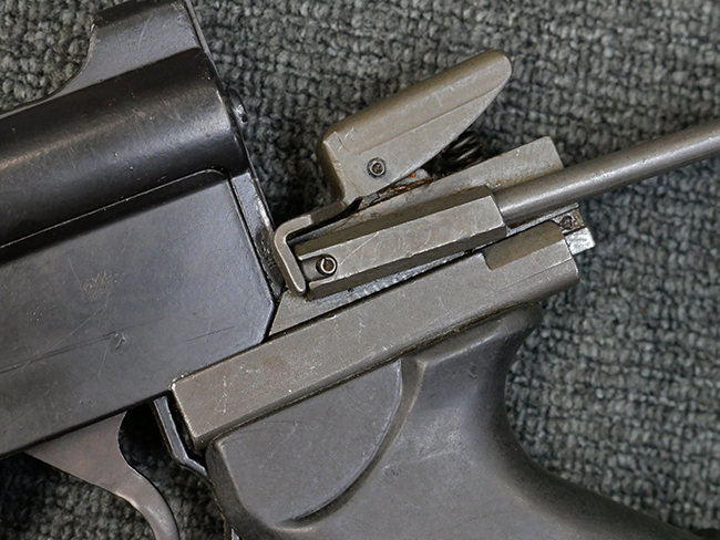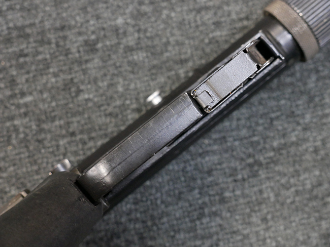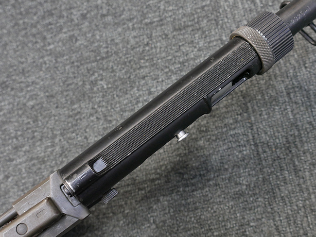 本品には若干の使用感が見受けられ、レシーバーや銃身にやや小傷や擦れ等は見られますが、大きな欠損等は見られず、比較的良好な状態が保たれています。 グリップ部分等の樹脂部についても、表面に小傷が表れていますが、こちらも目立った破損等は見られません。 ゴム製のグリップ・ボトム・カバーについても、目立った劣化等は見受けられず、適度な弾力が保たれています。 マガジンの着脱やワイヤー・ストックの伸縮については問題なく行う事が可能です。 ストックは展開時のがたつき等も殆ど見られません。 マガジンは一部が固定されています。