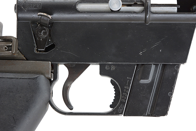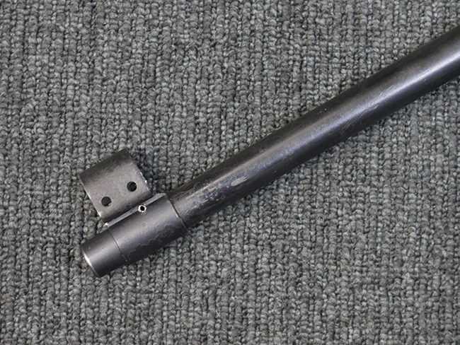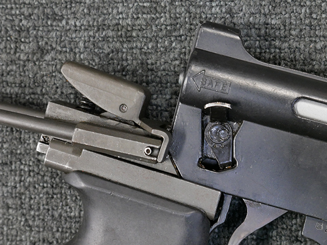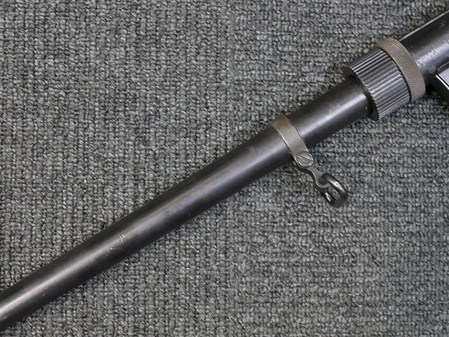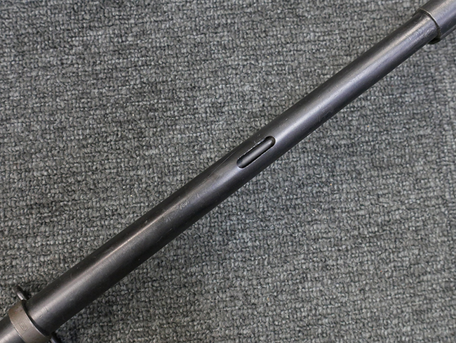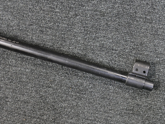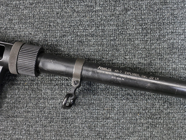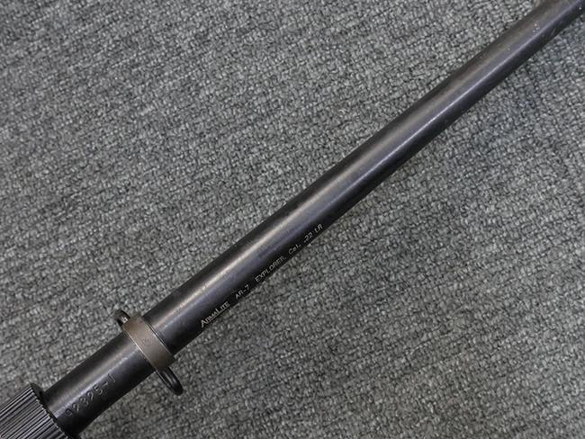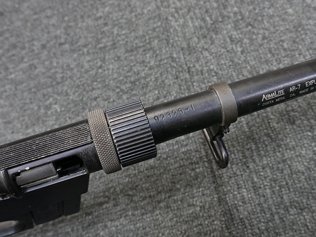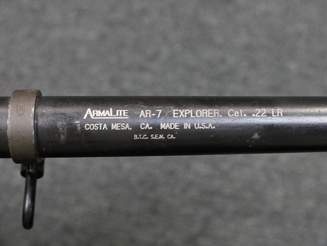 本品の銃身には、アーマライト社のロゴとともに「AR-7 EXPLORER, Cal. .22 LR」のモデル名刻印が入っており、トリガー・ガードにはシリアルNo.とともにヘブライ語の刻印が確認出来ます。 また、スリング・スイベルにも同様のヘブライ語刻印が入っています。 シリアルNo.は本体と銃身でマッチしています。