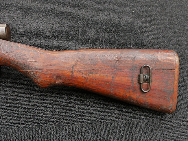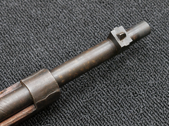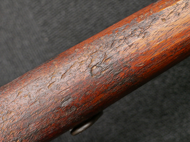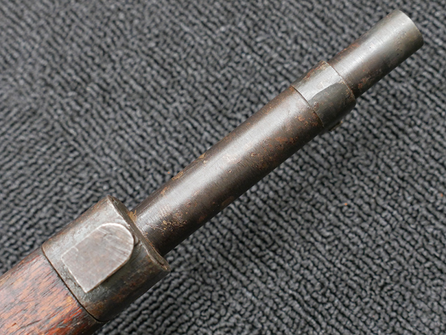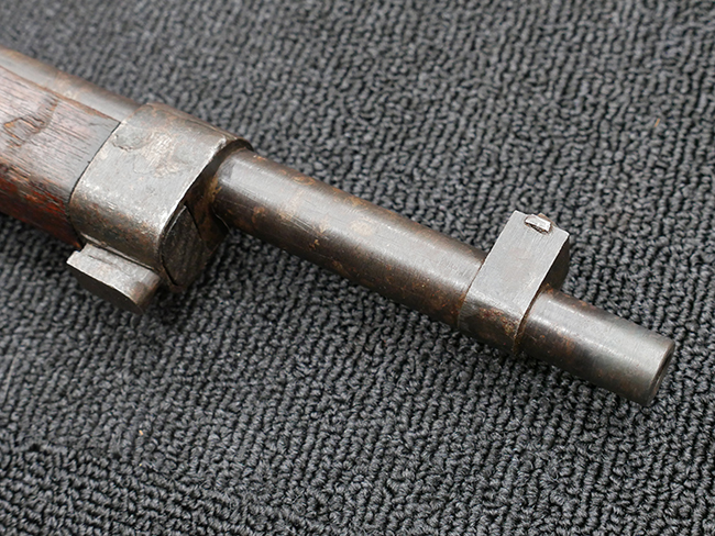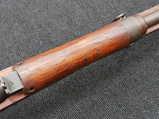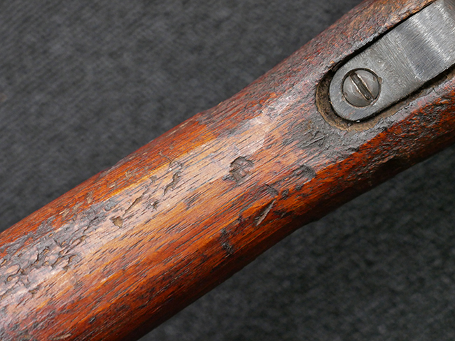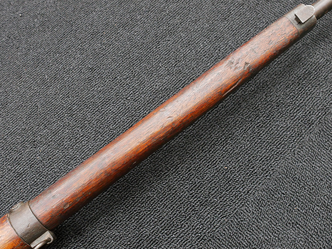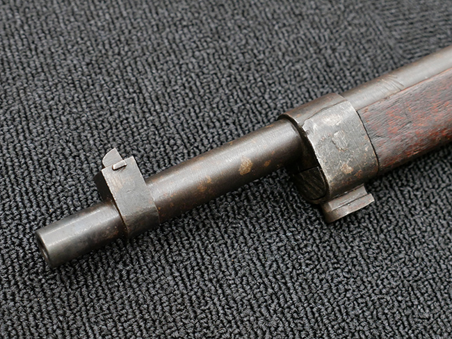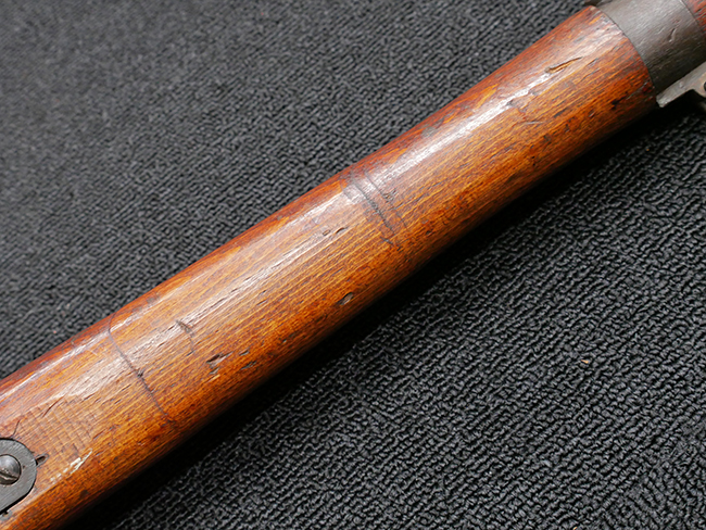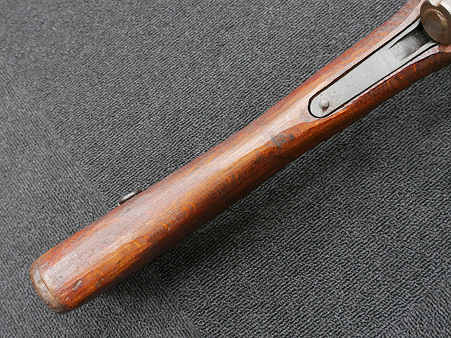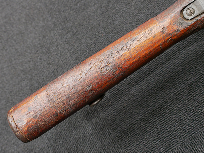 本品は全体に金属部には小傷や擦れ、若干の表面錆等の経年感は見られるものの、製造された時代を考慮すると十分に良好な状態が保たれています。 木部については所々打ち傷や擦れが見られますが大きな破損や欠損等は見られません。 末期型は前床が下帯部で分離式となっている構造のため本品もガタつきが見られます。 傷みやすい木製バット・プレートについても若干の打ち傷は見受けられるものの、目立った破損や欠損等は見受けられず、しっかりとした状態が保たれています。 旧軍特有の銃床上下の継ぎ目についても、若干の隙間が見られるものの大変良好な状態が保たれています。