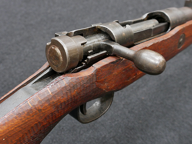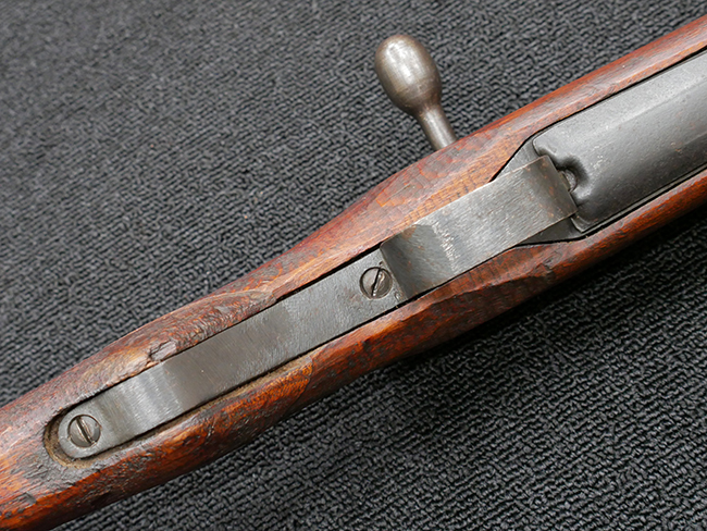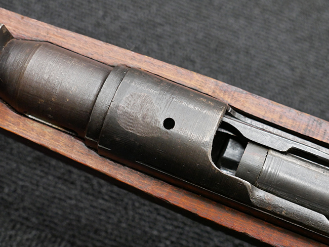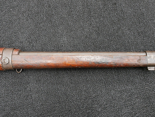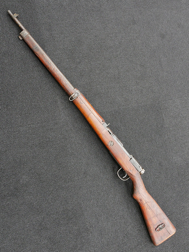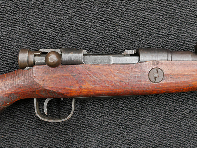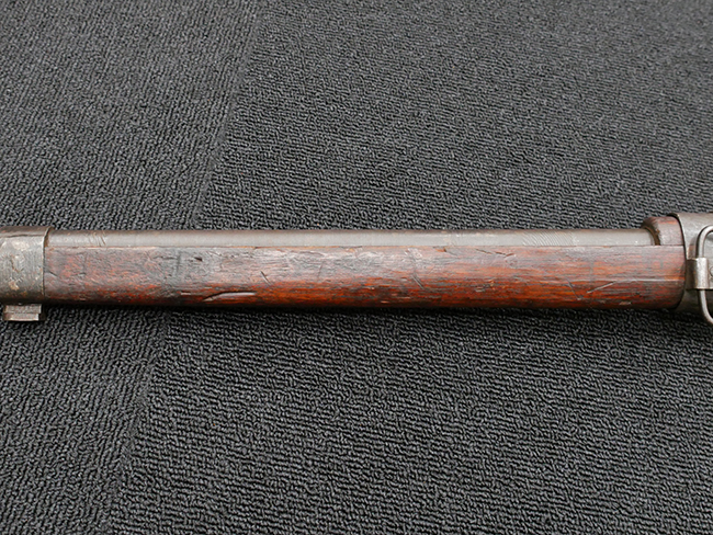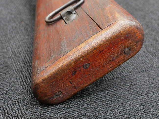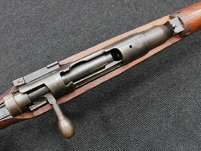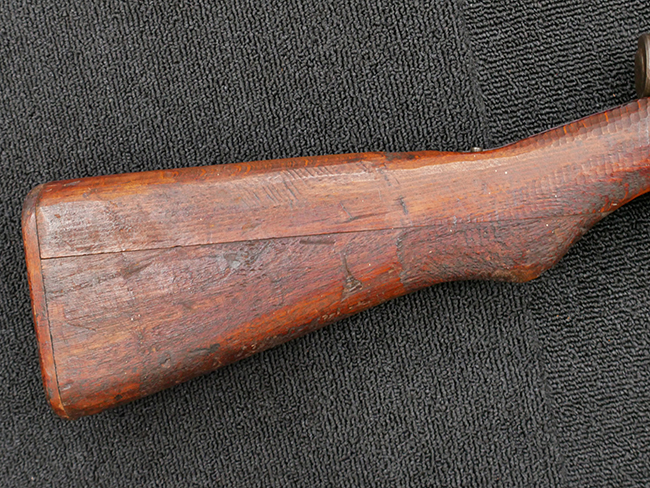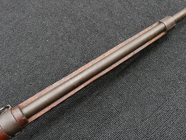 本品は全体に金属部には小傷や擦れ、若干の表面錆等の経年感は見られるものの、製造された時代を考慮すると十分に良好な状態が保たれています。 木部については所々打ち傷や擦れが見られますが大きな破損や欠損等は見られません。 末期型は前床が下帯部で分離式となっている構造のため本品もガタつきが見られます。 傷みやすい木製バット・プレートについても若干の打ち傷は見受けられるものの、目立った破損や欠損等は見受けられず、しっかりとした状態が保たれています。 旧軍特有の銃床上下の継ぎ目についても、若干の隙間が見られるものの大変良好な状態が保たれています。