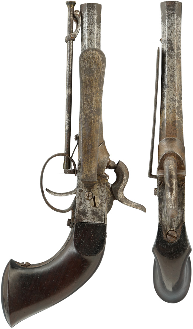 本品はドンドル銃と総称されている幕末に作られた管打式の単発拳銃です。 真鍮製の品と全く同じ構造ですが全鉄製で、途中までは鋳型で作れる真鍮製に比べ、鍛造の鉄製は高い技術力を求められました。 高度な火縄銃の製作技術を活かして作られました。 無銘ですが名のある鉄砲鍛冶の作品と思われます。