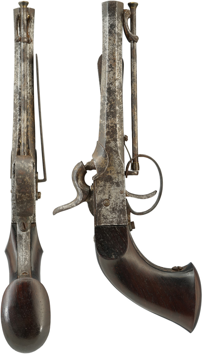 本品の銃身やベルト・フックといった鉄製部分については当初は白磨きであったと思われます。 現状は表面錆が多少出てはいますが 全体に適度な時代感が付いた良い雰囲気となっています。この磨かれていないオリジナルの状態が本品の価値を高めています。銃全体には、打ち傷や目立った欠損等は見られず 、各部の組付けはガタつきなく、しっかりとしています。 暗めの色付けされた木製グリップについても、当時の仕上げが良く残っています。作動については完全で、撃鉄はハーフ・コックは無く、フル・コックはしっかりと掛かり、フル・コック状態で引金を引くと撃鉄が力強く落ちます。 撃鉄はやや時代錆が表れていますが、目立った欠損や欠け等は見受けられず、しっかりとした状態が保たれていますが若干左右に振れますが許容範囲です。 銃身内は銃口から銃身後部まで完全に抜けて (通って) おり、火穴も抜けています。 パーカッション・ニップルについては、現状大きな欠け等は見られませんが絶対に空撃はしないでください。 桁外れに数多くのドントル銃を扱っている弊社でも、本品のような鉄製で真鍮製と同じ仕様に作っている品は初めてです。 資料価値の高い逸品です。 (MM)