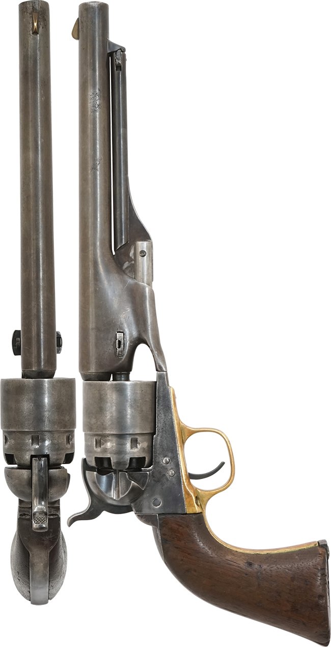 コルト社のパーカッション・リボルバーの特徴として銃身部分とフレーム部分がシリンダーを挟むように、前後に分解出来る構造になっています。 バレル・ウェッジと呼ばれる「楔」のような小さな部品を右から左に押し出す事によって、銃身部分とフレーム部分が容易に分離します。 シリンダーには1843年のカンペチェ海戦 (Naval Battle of Campeche) でテキサス海軍がメキシコ海軍を破る場面がエングレービングされています。 蛇足になりますが「M1860 Army Revolver」のモデル名は20世紀になってからコレクターが便宜上付けた名称で、発売当初のコルト社カタログでは「Colt Holster Pistol, Enlarged Caliber」となっています。 尚、「M1851 Navy Revolver」は「Colt Revolving Belt Pistol of Naval Caliber」です。(MM)