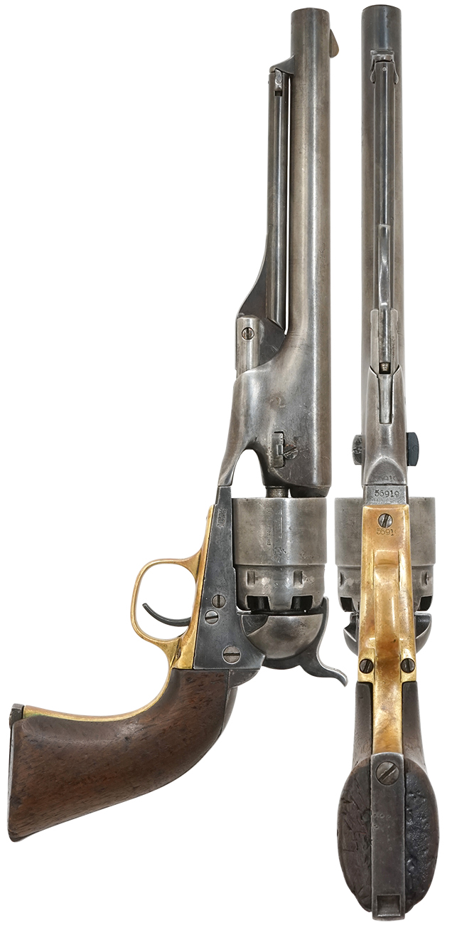 本品はM1860の中でもフレーム側面にショルダー・ストック取り付け用スクリューの無い、3 Screw Modelと呼ばれるシビリアン・モデルです。 本品のシリアルNo.は56919となっており、4 Screw Modelと呼ばれる軍用タイプの生産が終了した50,000以降の生産品である事ともマッチしています。 また、シリアルNo.からは1862年製である事も判ります。 尚、通常シビリアン・モデルでは上記のスクリューの他、ショルダー・ストック基部が嵌るリコイル・シールド部の切り欠きや、ストックを固定する為のグリップ・フレーム下部の溝が省略されていますが、本品にはこれらの切り欠きや溝が残されており軍用に使用する事を考慮した形になっています。 本品のシリアルNo.は銃身、フレーム、トリガー・ガード、グリップ・フレーム、シリンダー軸でマッチしています。 シリンダー軸のシリアルNo.は691の部分のみ確認できます。 シリンダー表面のカンペチェ海戦 (Naval Battle of Campeche) の場面のエングレービングはほぼ完全に消えており、「PATENT No./PAT.SEPT.10TH 1850」の部分は判読可能です (但し、登録証にはシリンダーの刻印として「PATENT TATSSBPT10□1850」と記載されています)。 フレーム左側面には「COLTS PATENT」の刻印がはっきりと残っています。
