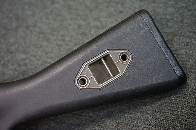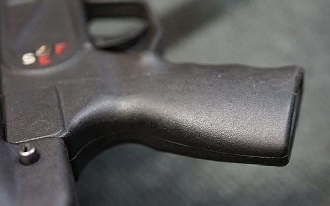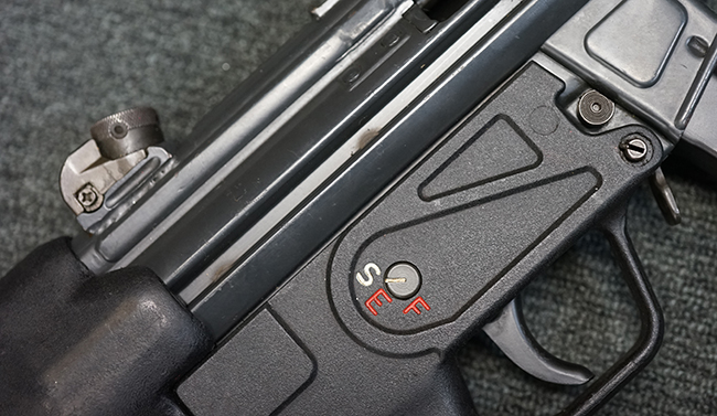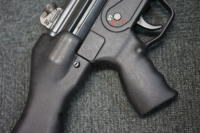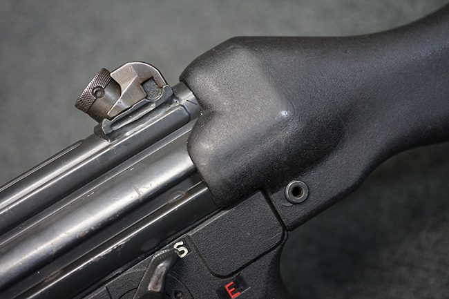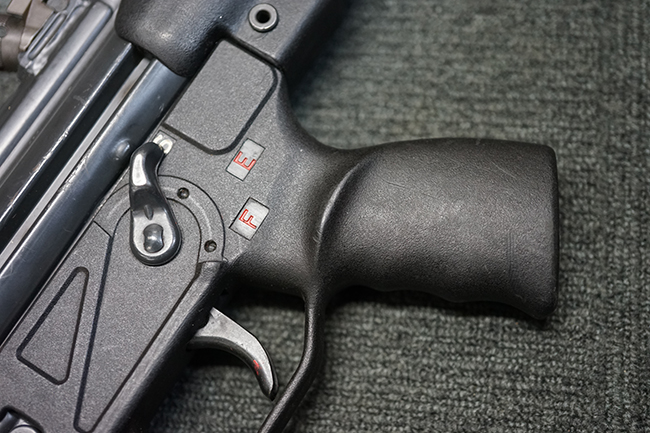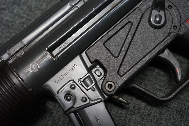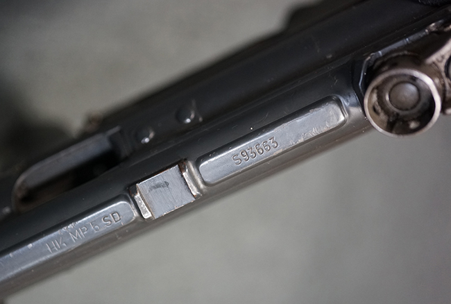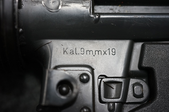 本品はドイツHK社製オリジナルのMP5SD2 短機関銃で、レシーバー上面にはシリアルNo.に加えて「HK MP5 SD」のモデル名刻印が入っています。 マガジン・ハウジング左側面の口径表示は「Kal.9mm×19」のドイツ語表記となっています。 トリガー・ハウジングはセレクターが「S-E-F」のアルファベット表示で、グリップ前部にフィンガー・チャンネルの有るタイプとなっています。