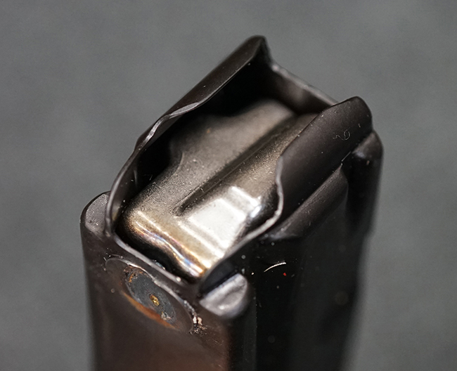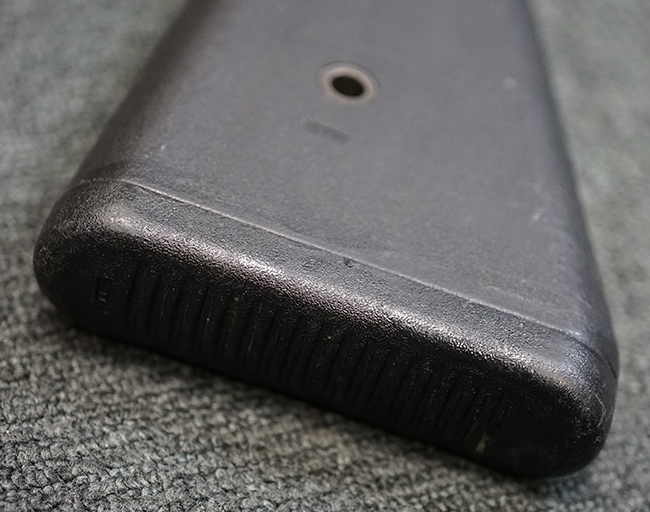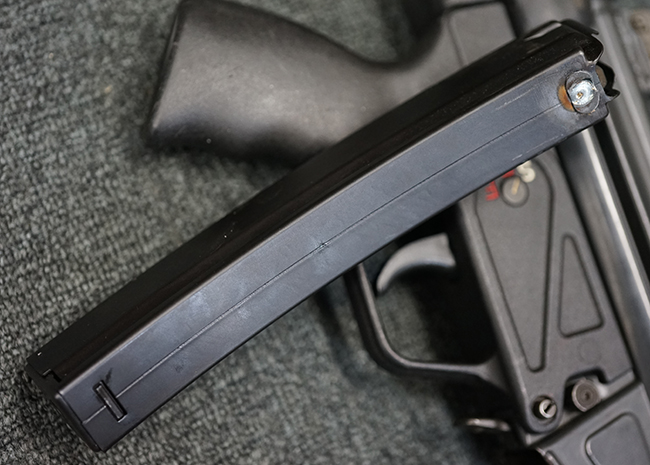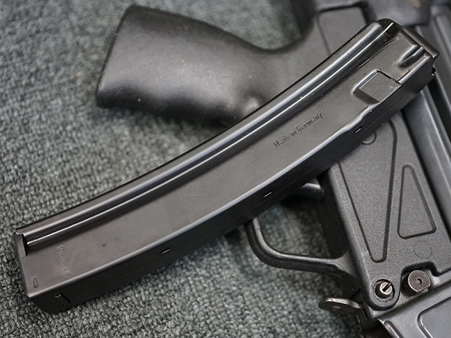 マガジンの着脱やリア・サイトの調整については問題なく行う事が可能です。 マガジンは装着時の遊びも十分許容レベルです。 付属の30連バナナ・マガジンには「9mm×19」及び「Made in Germany」の刻印が入っています。 マガジンは使用感も少なく、僅かな小傷や擦れを除いて現状目立った凹みや変形などは見受けられず、良好な状態が保たれています。 マガジンは一部が固定されています。