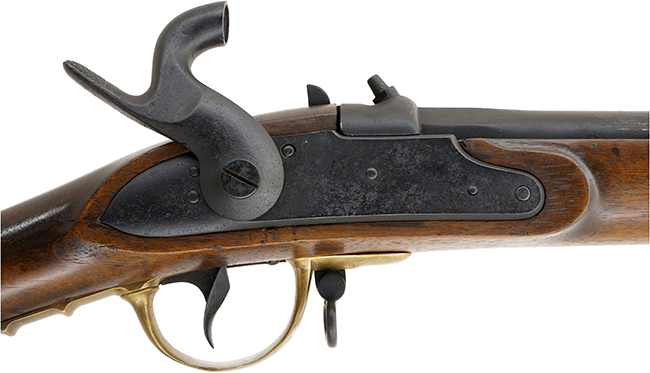 作動については完全で、ハンマーのフル・コックはしっかりと掛かり、トリガーを引くとハンマーが力強く落ちます。 本品はハンマーをニップルから僅かに持ち上げた位置にハーフ・コック・ポジションが存在します。 ハンマーは起こした状態で左右にやや遊びが見られますが、機能的には問題ありません。 銃身内は銃口から銃身後部まで完全に抜けて (通って) おり、火穴も抜けています。 パーカッション・ニップルについても現状目立った欠けや変形等は見られません。 鉄製のさく杖が付属いたします。 (KK)