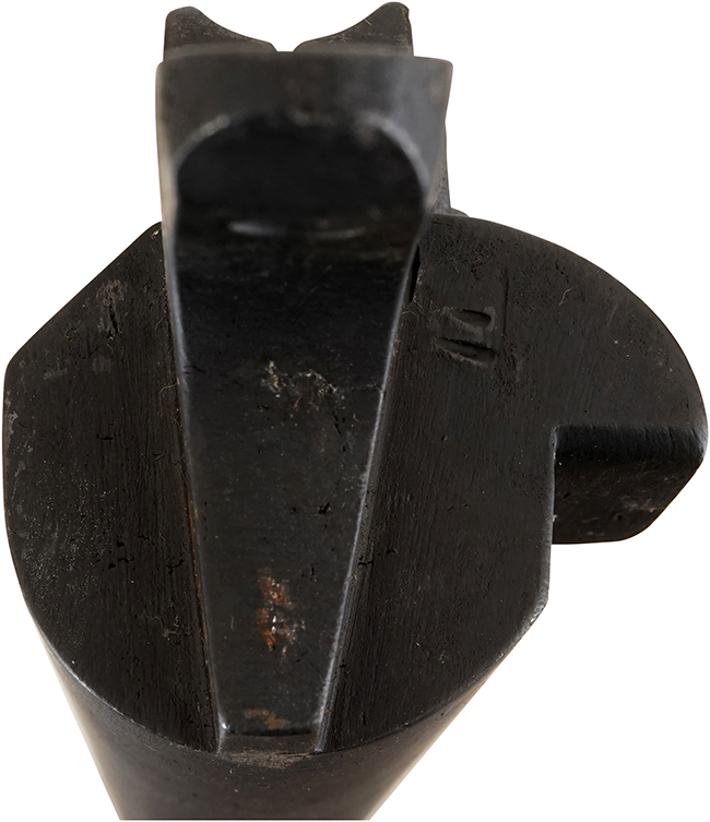 本品の銃身後端には、漢数字の「二」に見える刻印が打刻されていますが、それ以外に、オランダ製または日本製と判断できる刻印は一切確認出来ません。 本品の形状はオランダ製ゲベール銃を忠実に模作していますが、ロック・プレート内側のシアなど、撃発装置の作りを見ると、和製らしい印象を受けます。 これほど完全にコピーされた和製ゲベール銃は珍しい例といえます。
