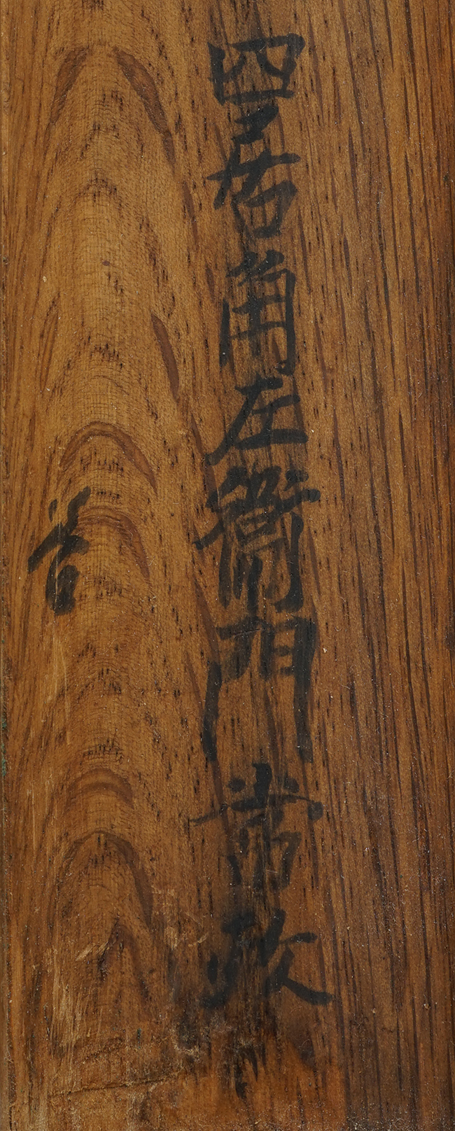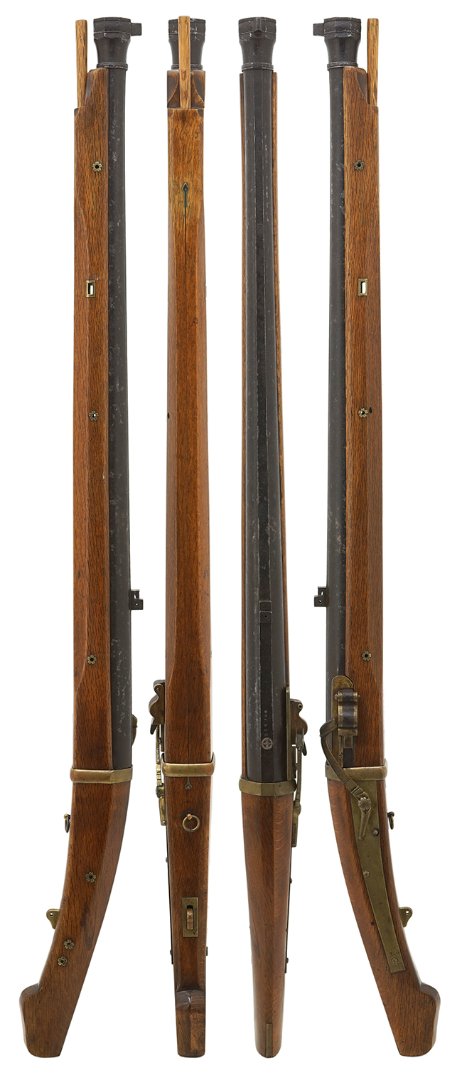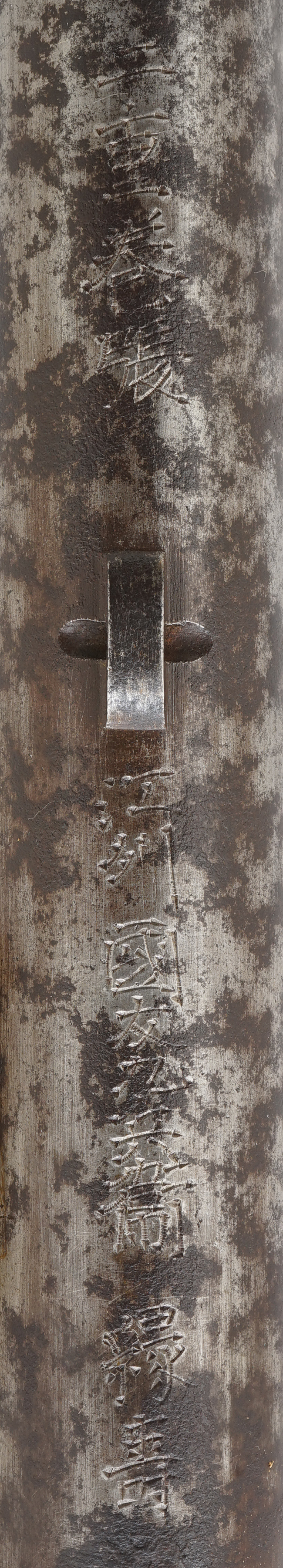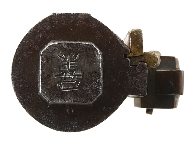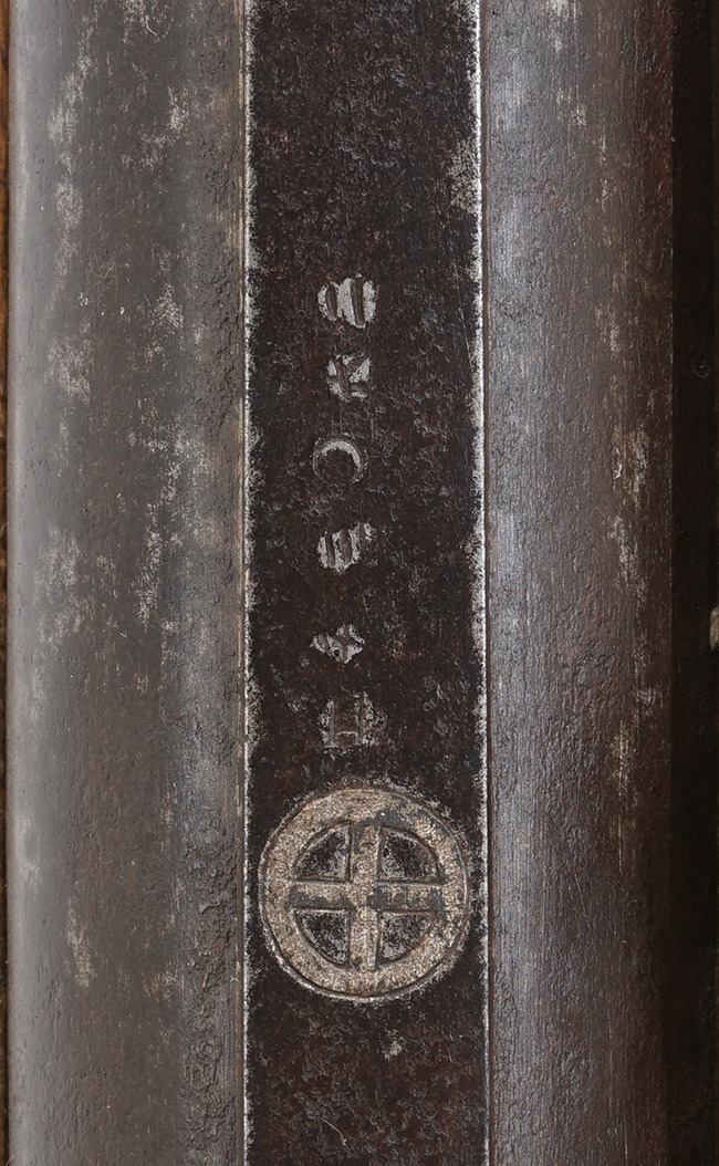 本品の銃身下面には「江州住國友九兵衛緑寿」の銘が見事に切られています。「江州住國友九兵衛緑寿」は「全国鉄砲鍛冶銘鑑」のP.105、及び「全国鉄砲鍛冶銘地域別分類」のP.◯◯に掲載されています。「九兵衛緑寿」の現存品の中に「宮下家 九兵衛子孫 安政二年」の年記が入った品が確認されていますので、江戸時代末期の安政年間(1855-1860年)の鉄砲鍛治と考えられます。
